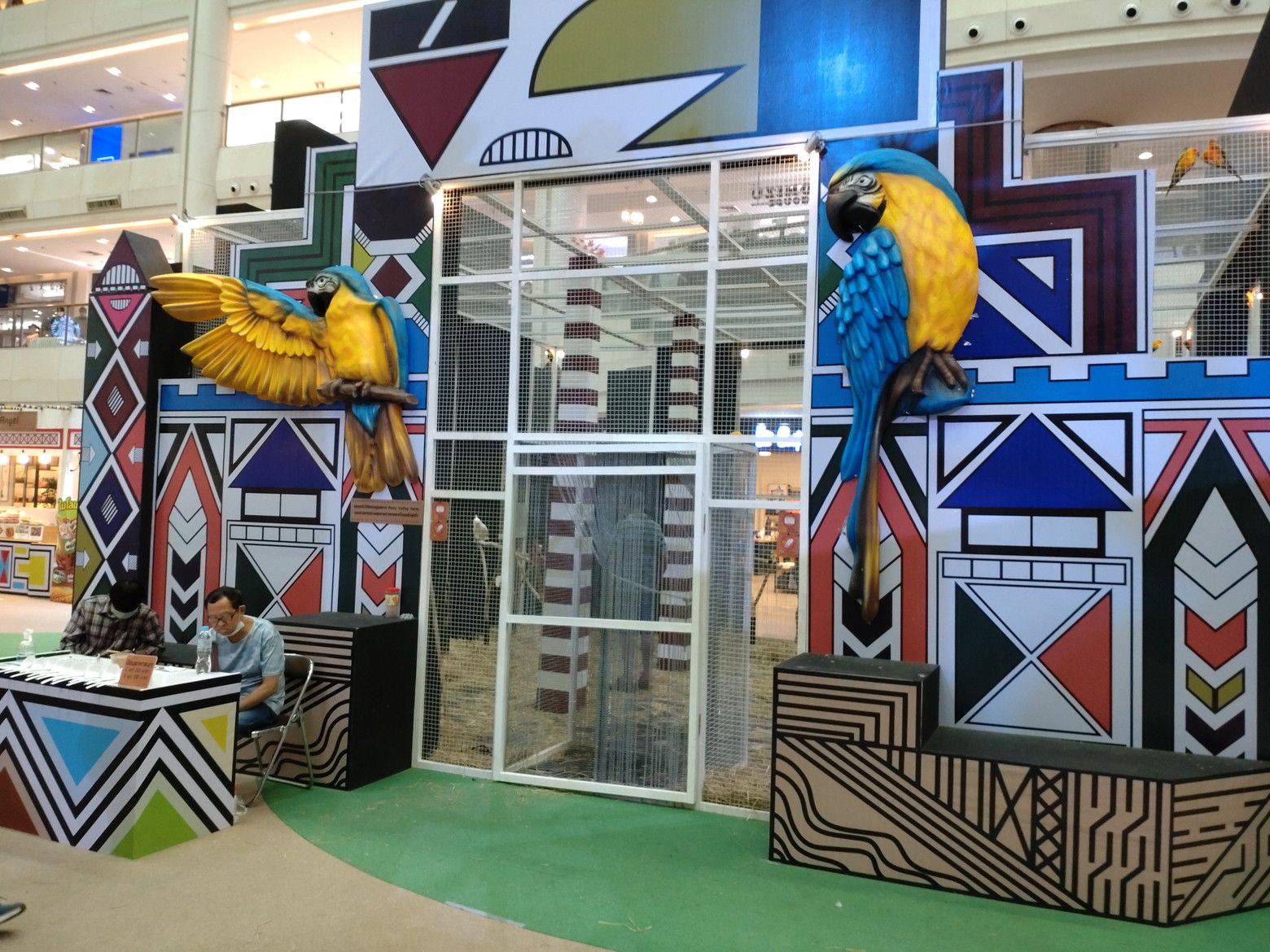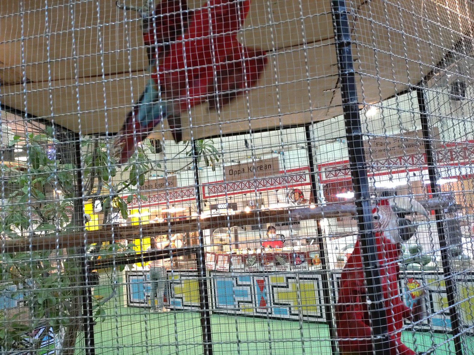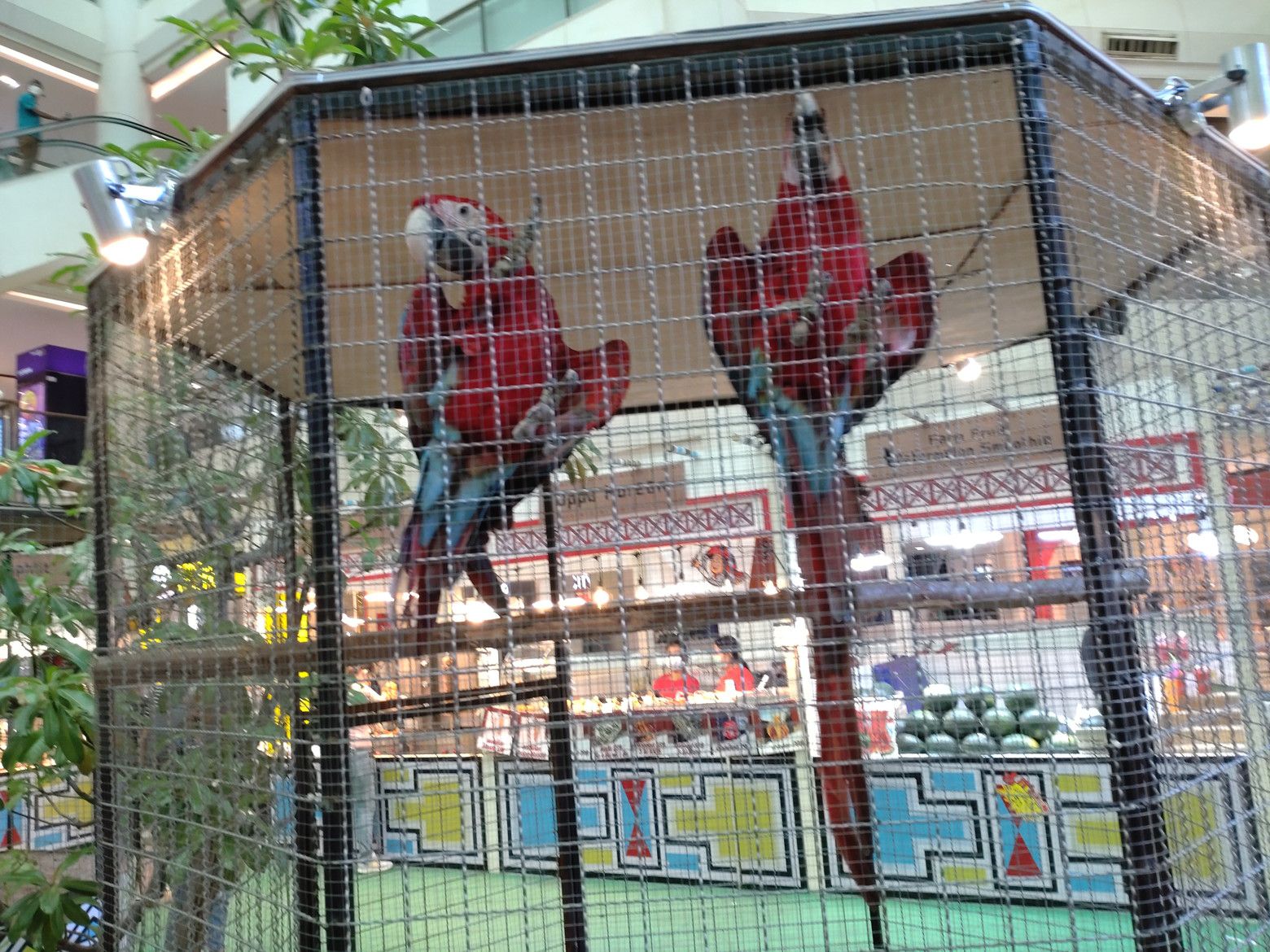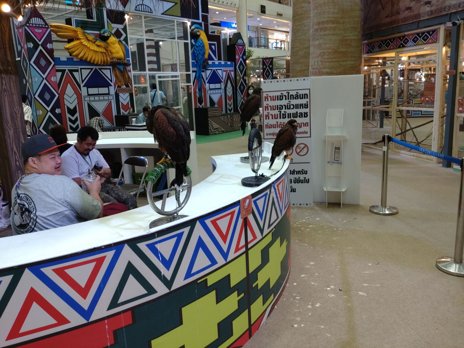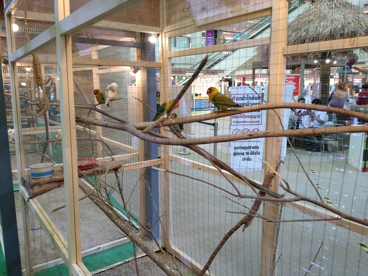 上からの眺めでは、イマイチ何をしているのかが不明でした。 降りてみると、鳥の鳴き声が聞こえてきました。 どうやら、鳥の動物園のような催しでした。 こんな機会は滅多にありませんので、ブラブラする事にしました。 遠い昔ではありますが、小学校の頃にインコを飼った事がありますので、懐かしいです。 ジーッとしている鳥も居れば、動き回る鳥も居て楽しいです。 ここは、騒々しいコーナーでした。 主催者のコーナーでしょうか?フクロウが放し飼い?