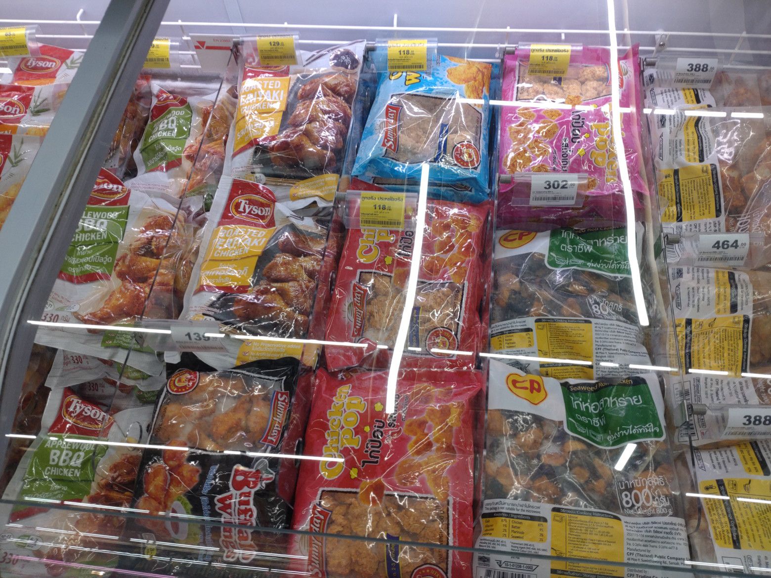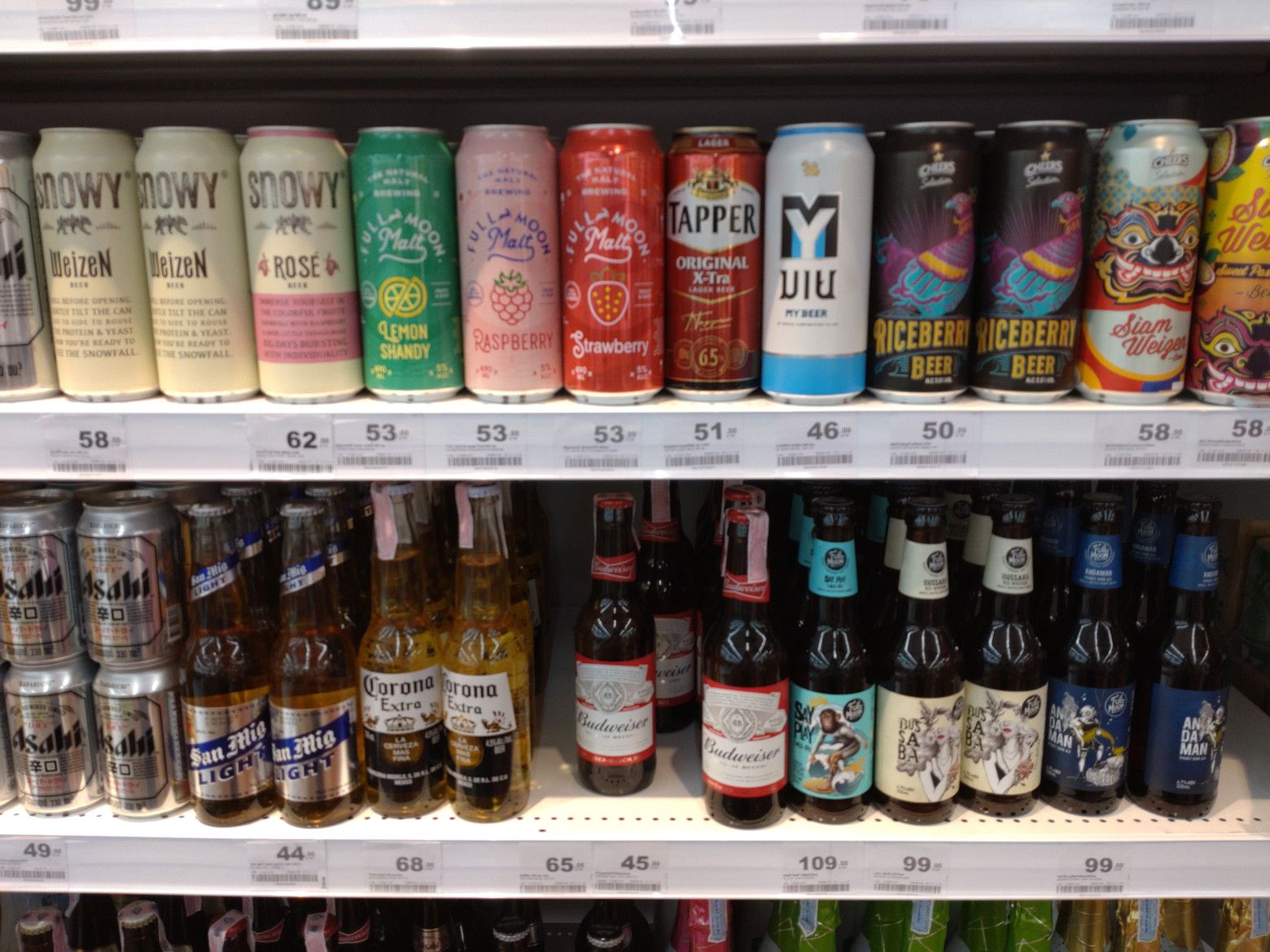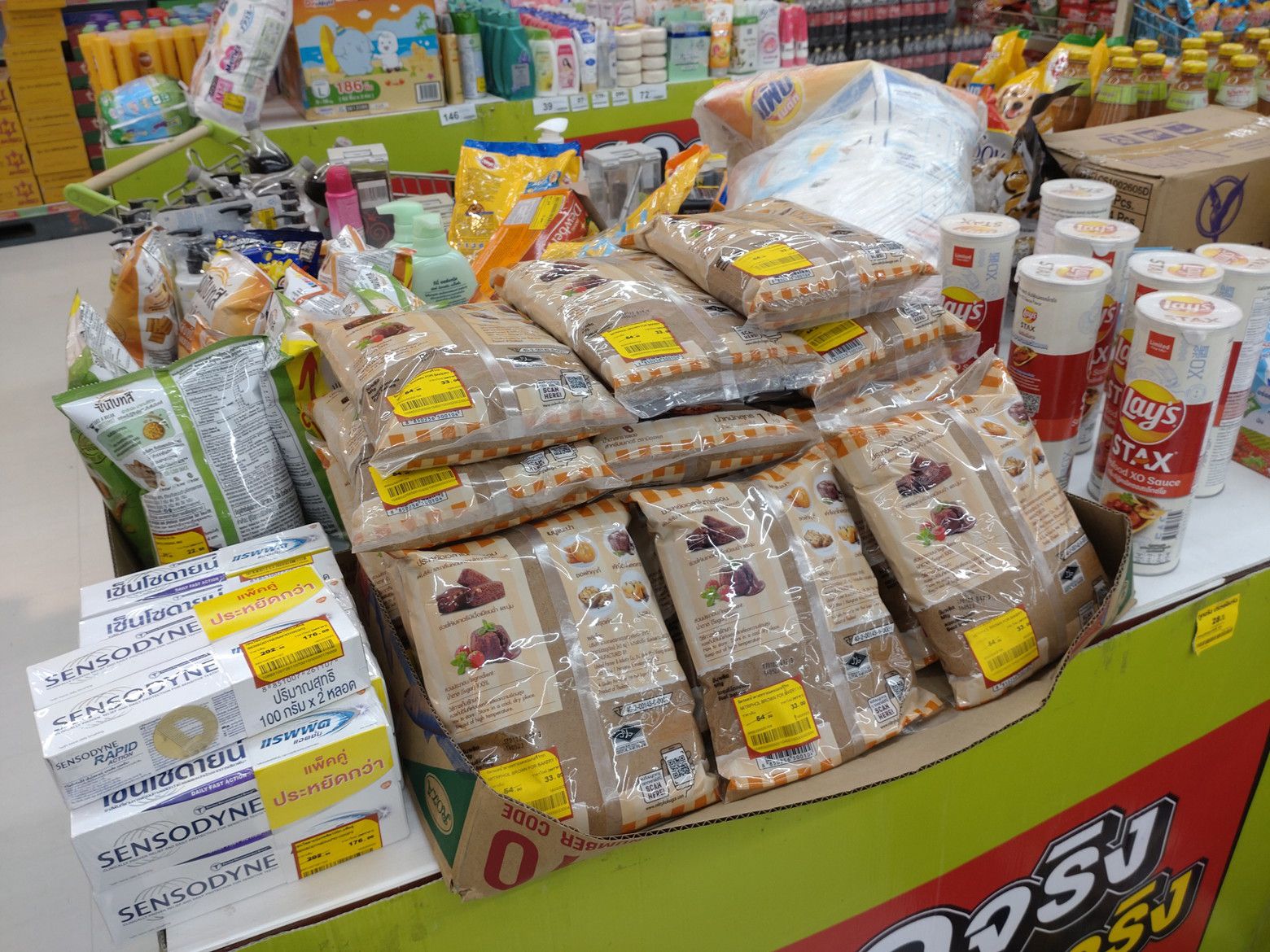 ロビンソンを出てからは。。。 通りを挟んで向かい側のBIG-Cへ。 1階はテナントが入り、2階が店舗。 兎に角広いんです。 この日は、野菜や豆腐の買い足しです。 最初に此処へ来て驚いたのは、割引商品が多い事でした。 この黄色い値札が割引価格です。 こんな具合なんです。 勿論、賞味期限が迫っている事も要因でしょうが、直ぐに食べるには問題ない物に関しては非常に助かっています。 これを知ってから、頻繁に来るようになりました。 冷凍食品にも黄色の値札があります。 この日は、鶏唐揚げを籠に入れました。 珍しいビールも1缶。 これで会計です。 後日に食べる事にしました。