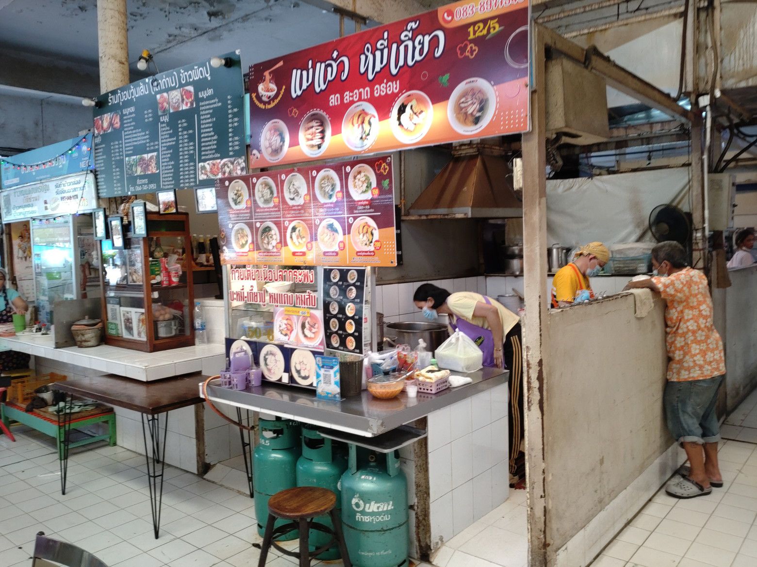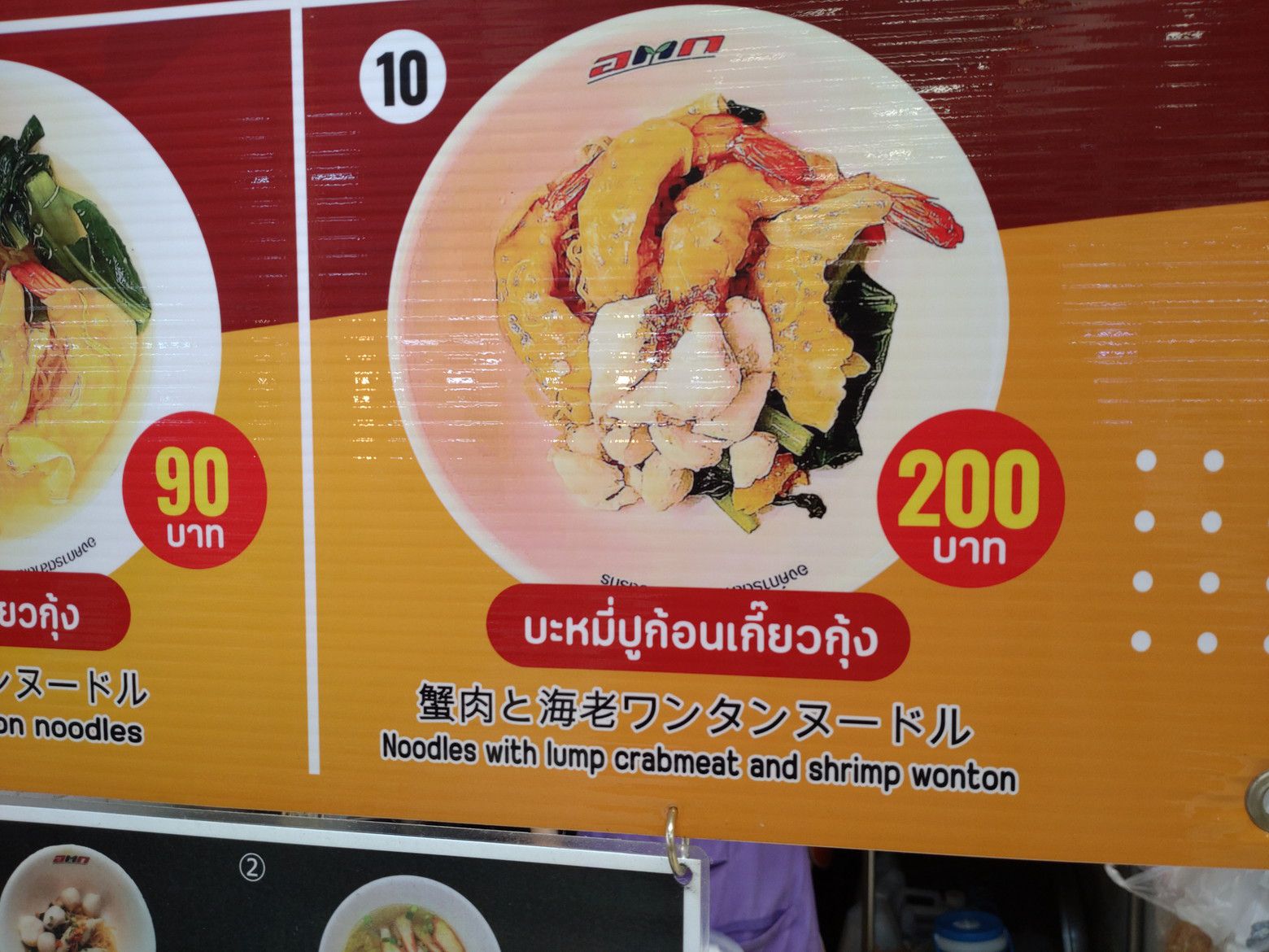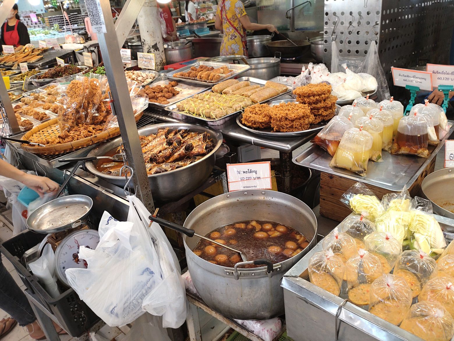 もう何度も来ている市場。 前回来た際は、観光客で賑わっていたのだけれど、この日はガラガラ。 まずは、乾物コーナーを覗いたのですが、パクナム市場で売っている自分が好む商品は売っていませんでした。残念。 そこから、惣菜コーナーを一応。。。覗いたのですが、経験上では砂糖の甘さが強い印象なので、スルー。 やはり、フードコートが、安心なんです。 しかも、以前に持ち帰って食べたこの店の麺料理が忘れられません。 前回は蟹らーめんでしたが! 今回は、これに決定!! 店員さんは、手際よく包んでくれました。 食べる当日は、スープを熱々にしました。 この店は、スープが美味しいんです。 サッパリ系の薄味スープですが、しっかりとした旨味があって麺がズルズルと胃袋に入って行きます。