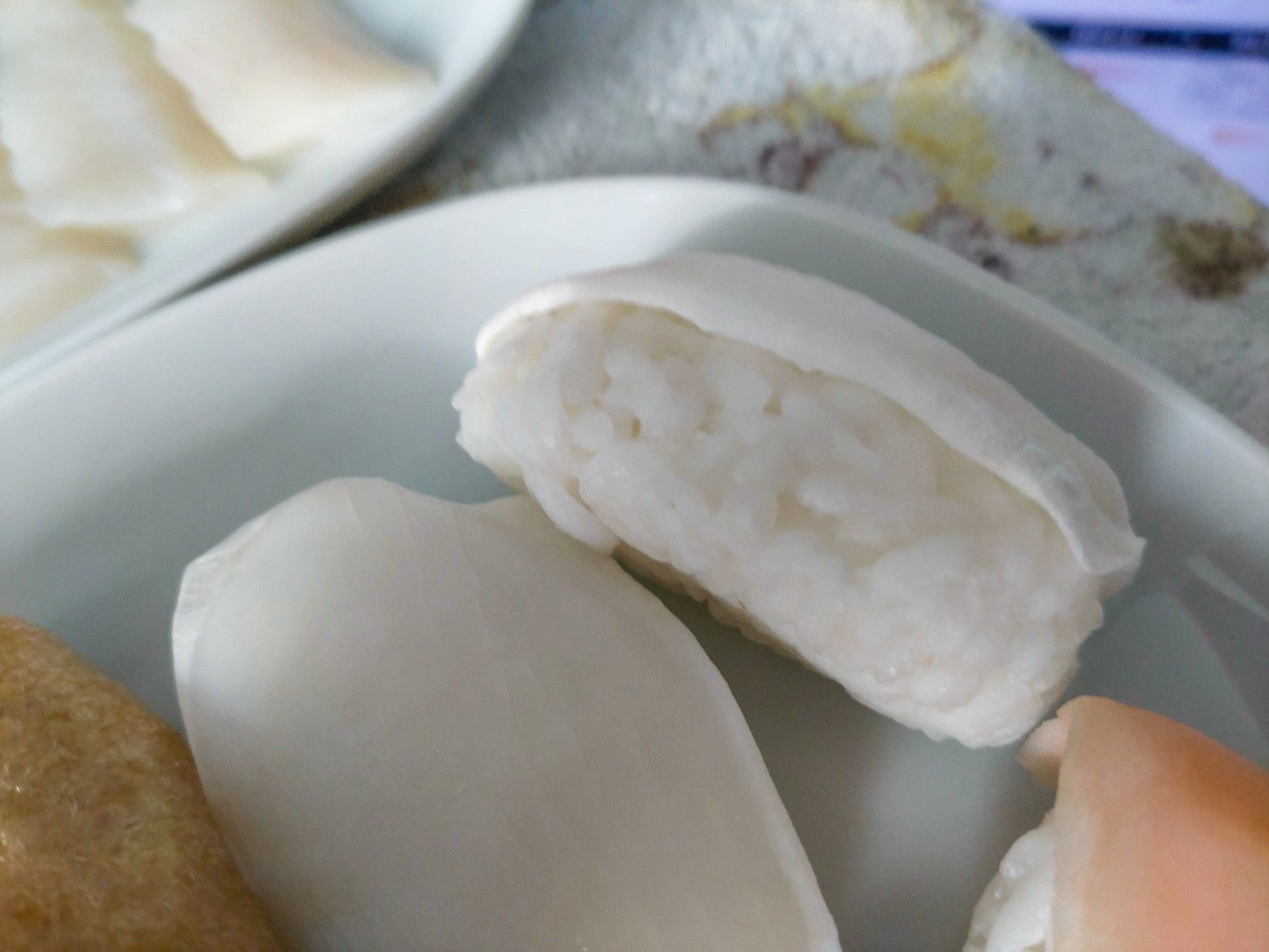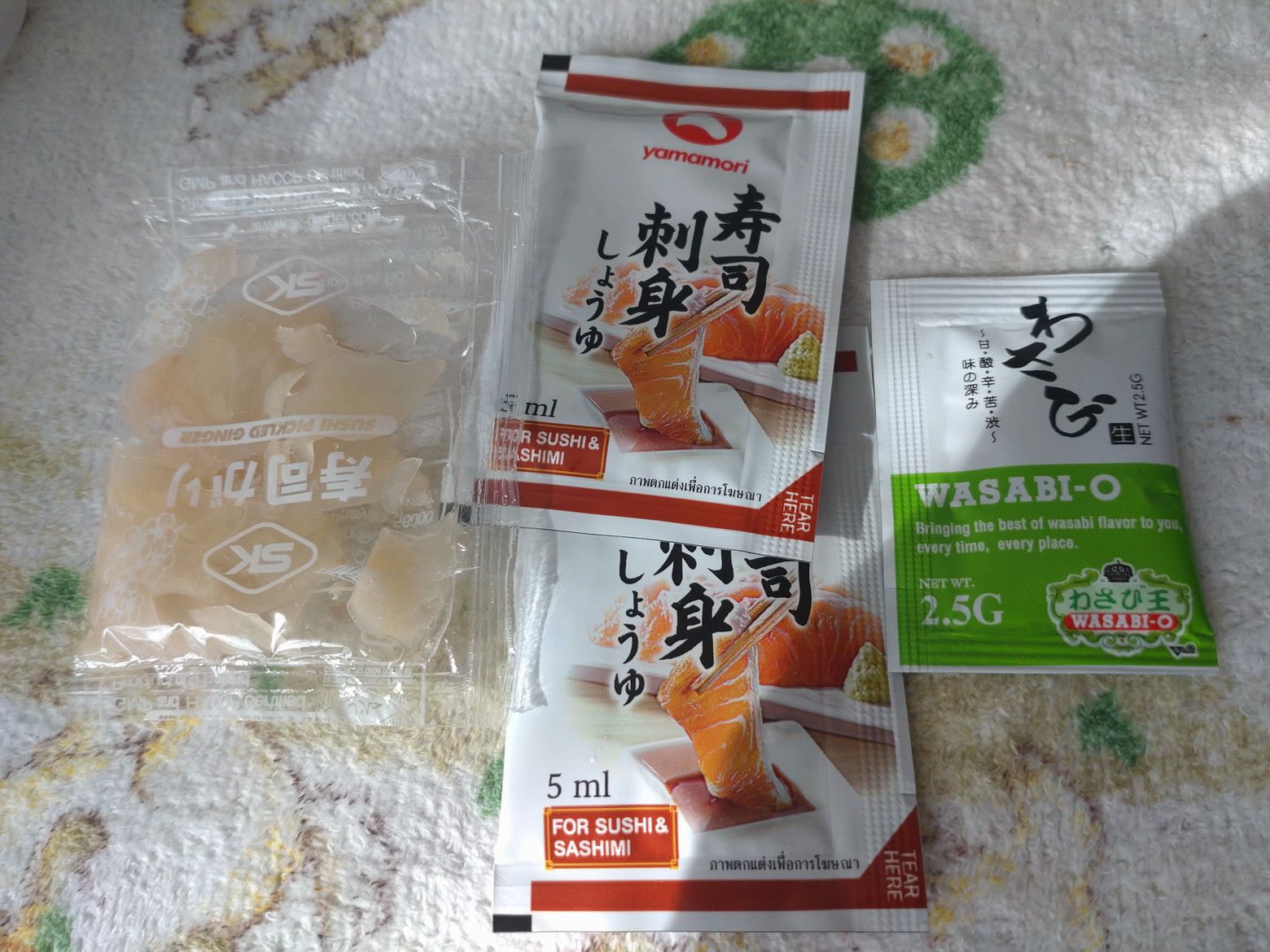 ゆっくりと常温にすると、良いのではと思ったのですが。。。 ちゃんと、ワサビと醤油も付いてました。 実は、皿に盛り付けた際に寿司に触れた段階で結果が判ってましたので、急遽刺身を取り出しました。