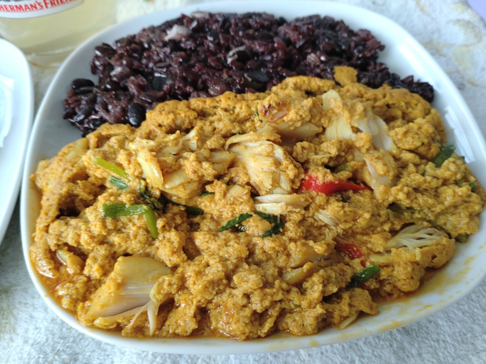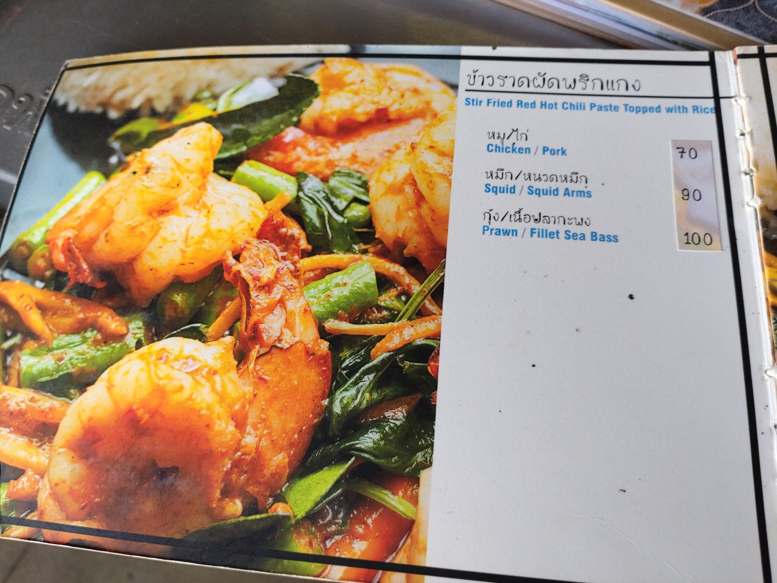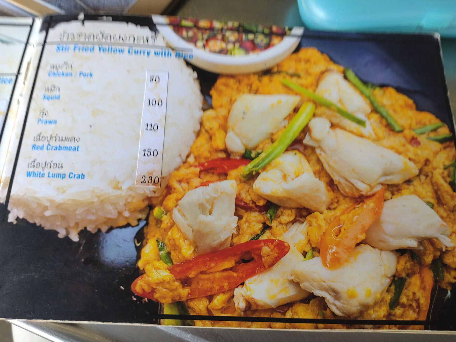 フードコートかな? そう思って、まずは休憩の為に着席すると、メニューを持って来てくれました。 座った席の正面の店のメニューでした。 見てみると、美味しそうな料理がズラリ。 蟹カレーに決まり! 受け取り完了。 美味そうですね。 食べてみると、辛さは少々。
