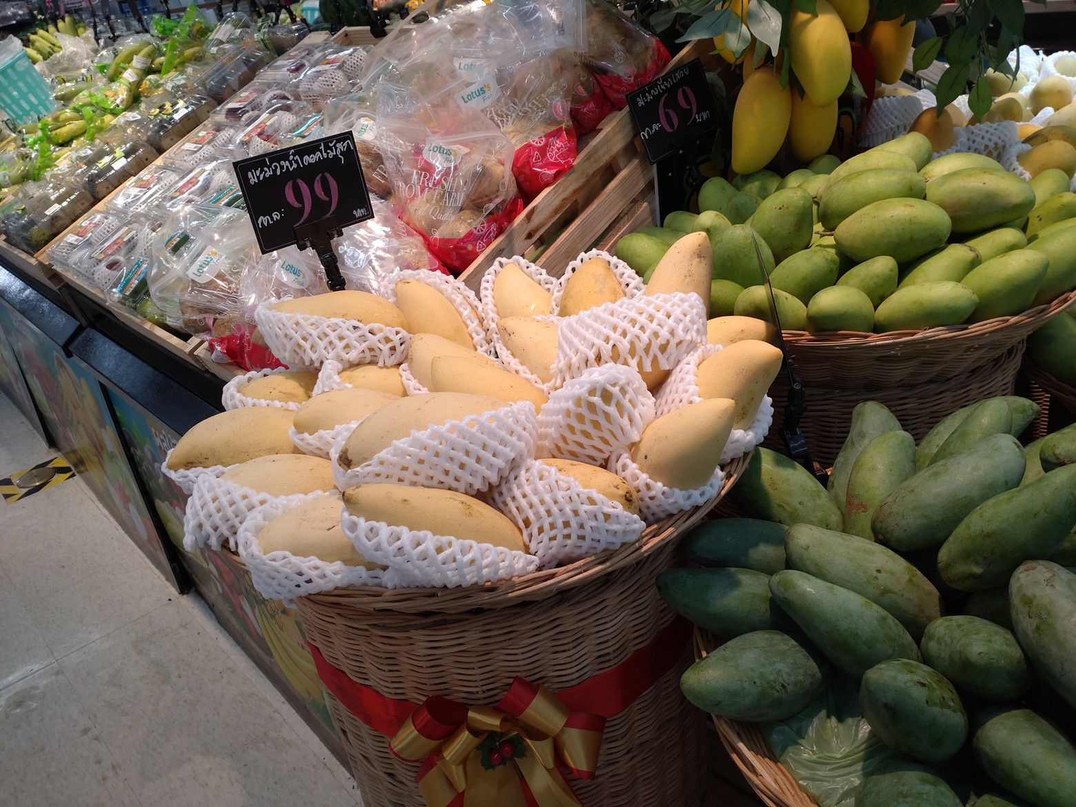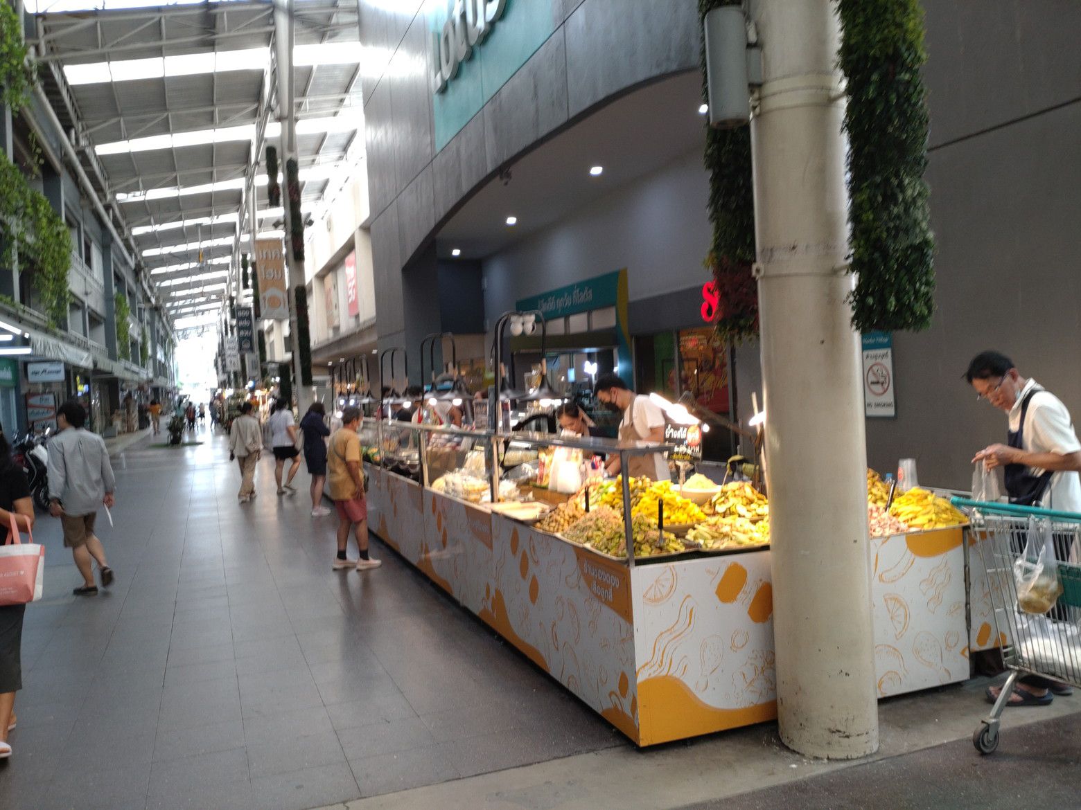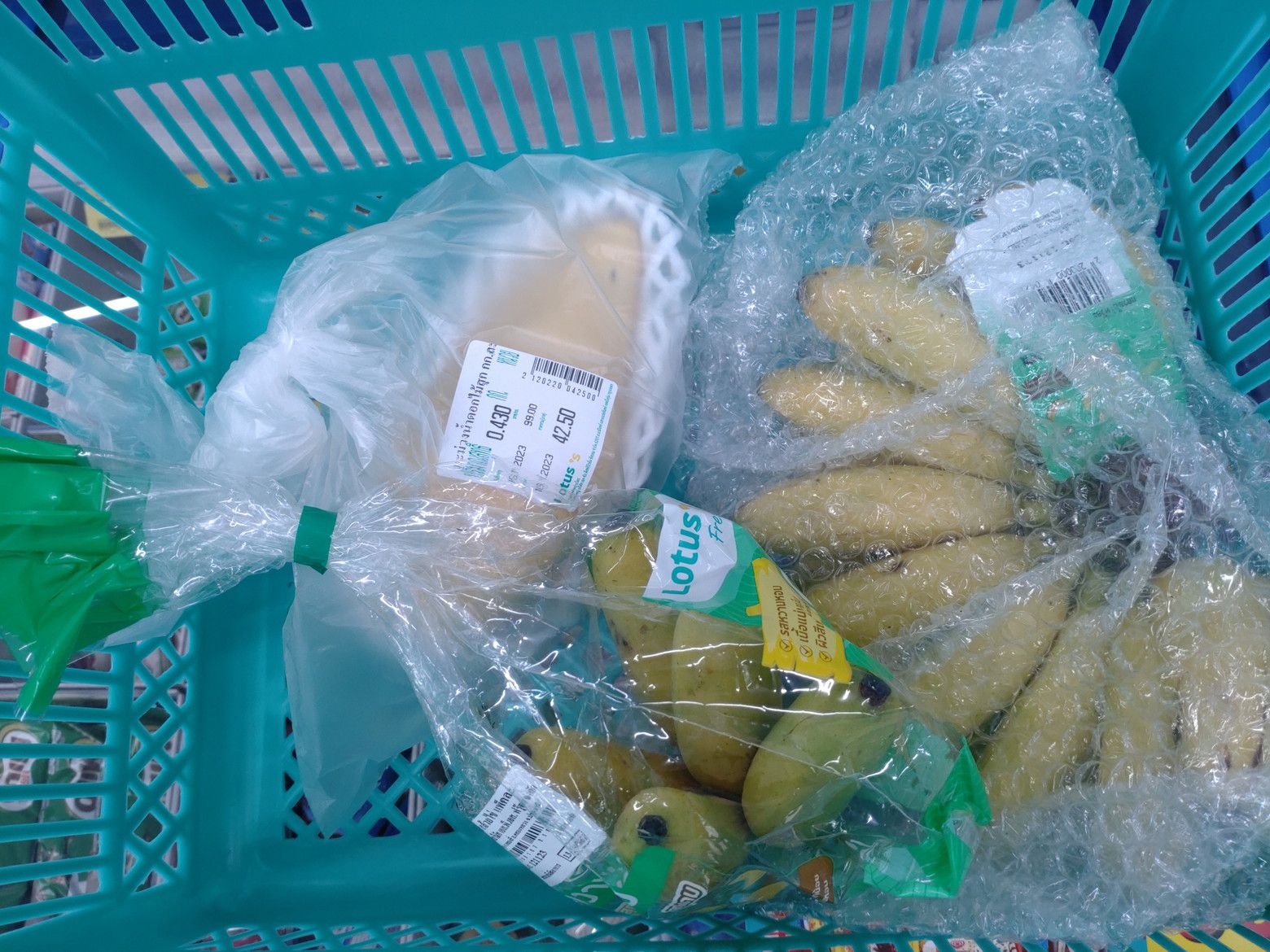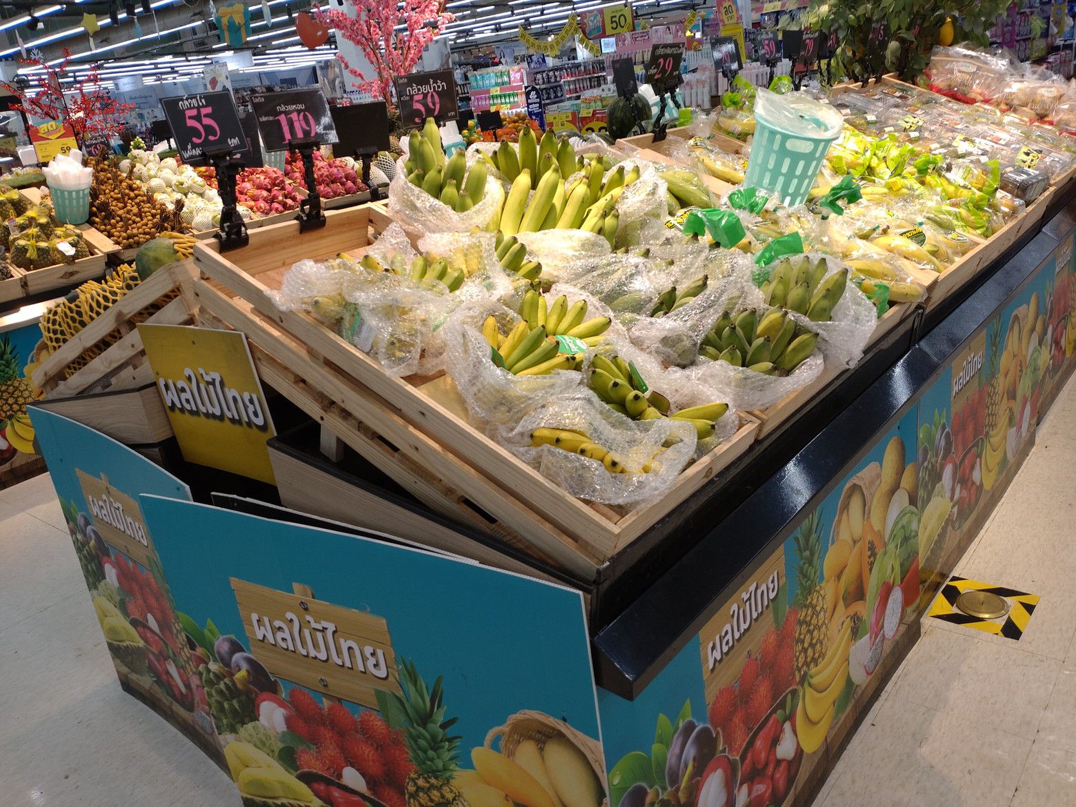 何故かグーグルでは表示されていないのですが。。。 マーケットビレッジの奥へ進むと、ロータスが在ります。 丁度、バナナが無くなったので、ここで買って帰る事にしました。 果物がある場所を探すと、ありました。 非常に綺麗に並べられていました。 目的のバナナを発見。 好みの細くて短いバナナもありました。 久しぶりにマンゴーも1個。 これで会計しました。 さて!残念ながら此処にはフードコートが無いんです。