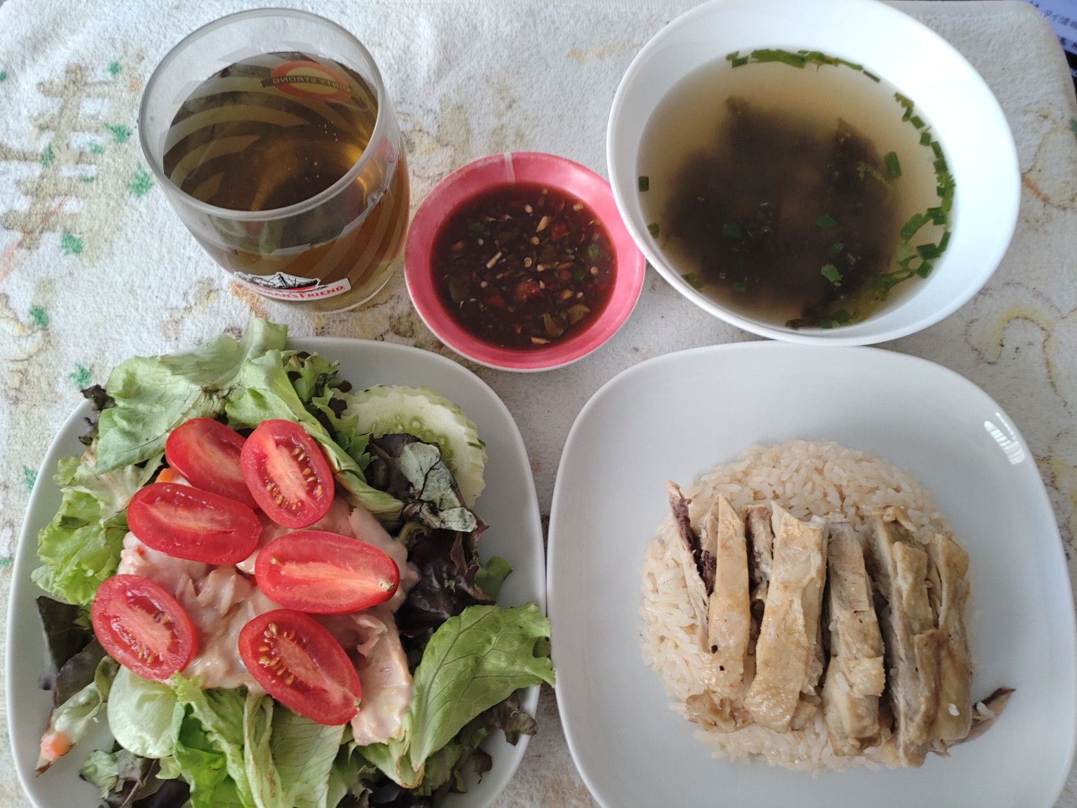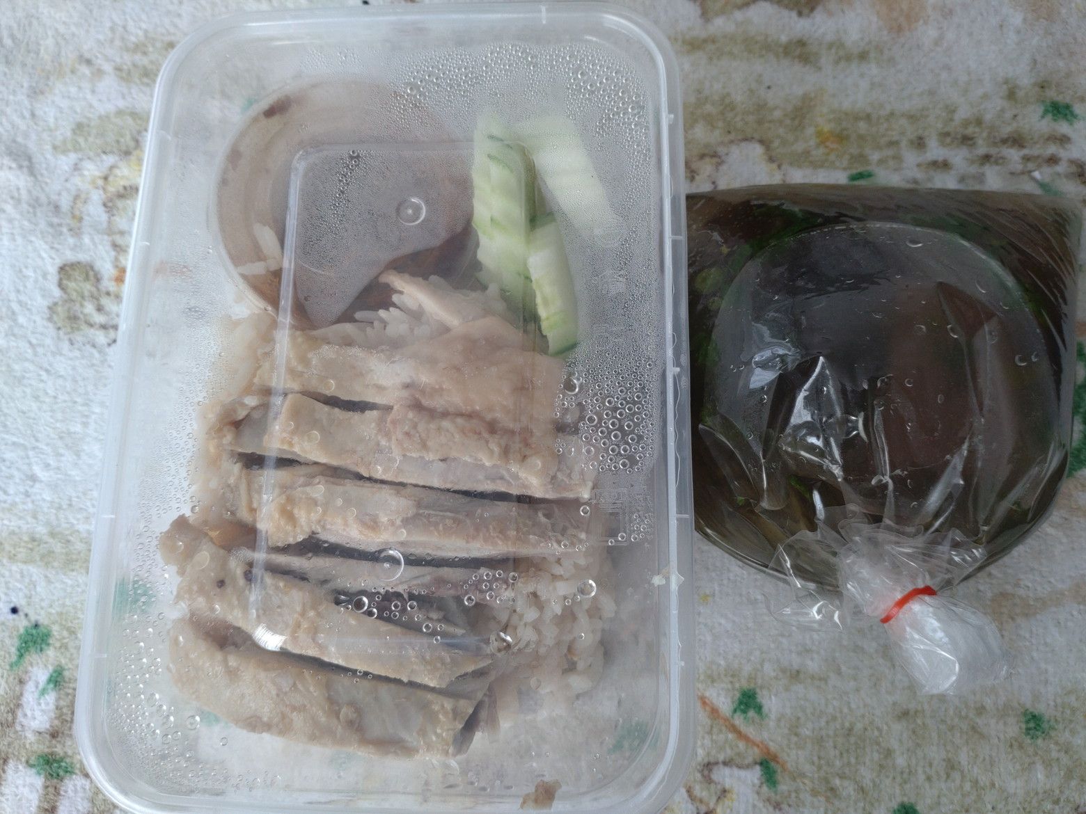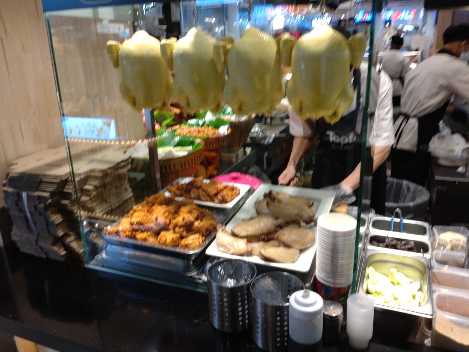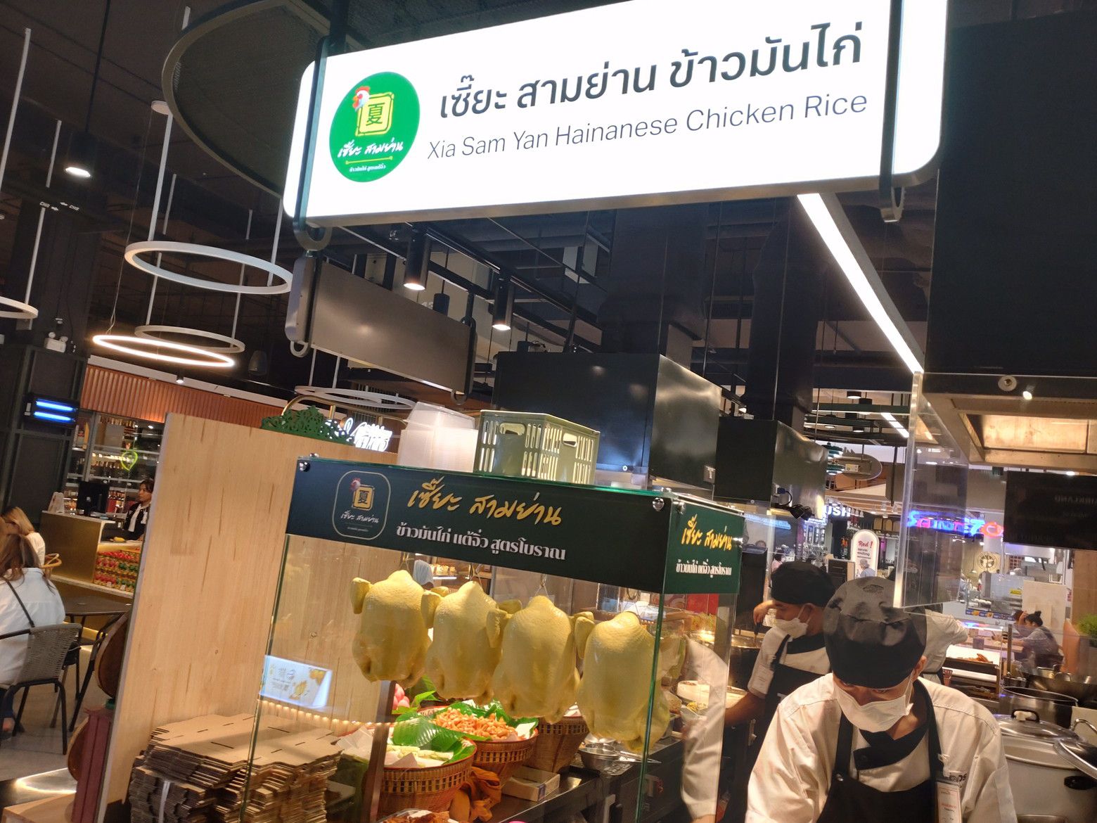 パンとドリンクで、寛ぐ方々です。 自身は、小さな店が集まる場所へ行きました。 色々と、見て回りました。 結果は、この店にしました。 カオマンガイの店です。 60バーツ。 後日です。 頂きます! 美味しかったです。