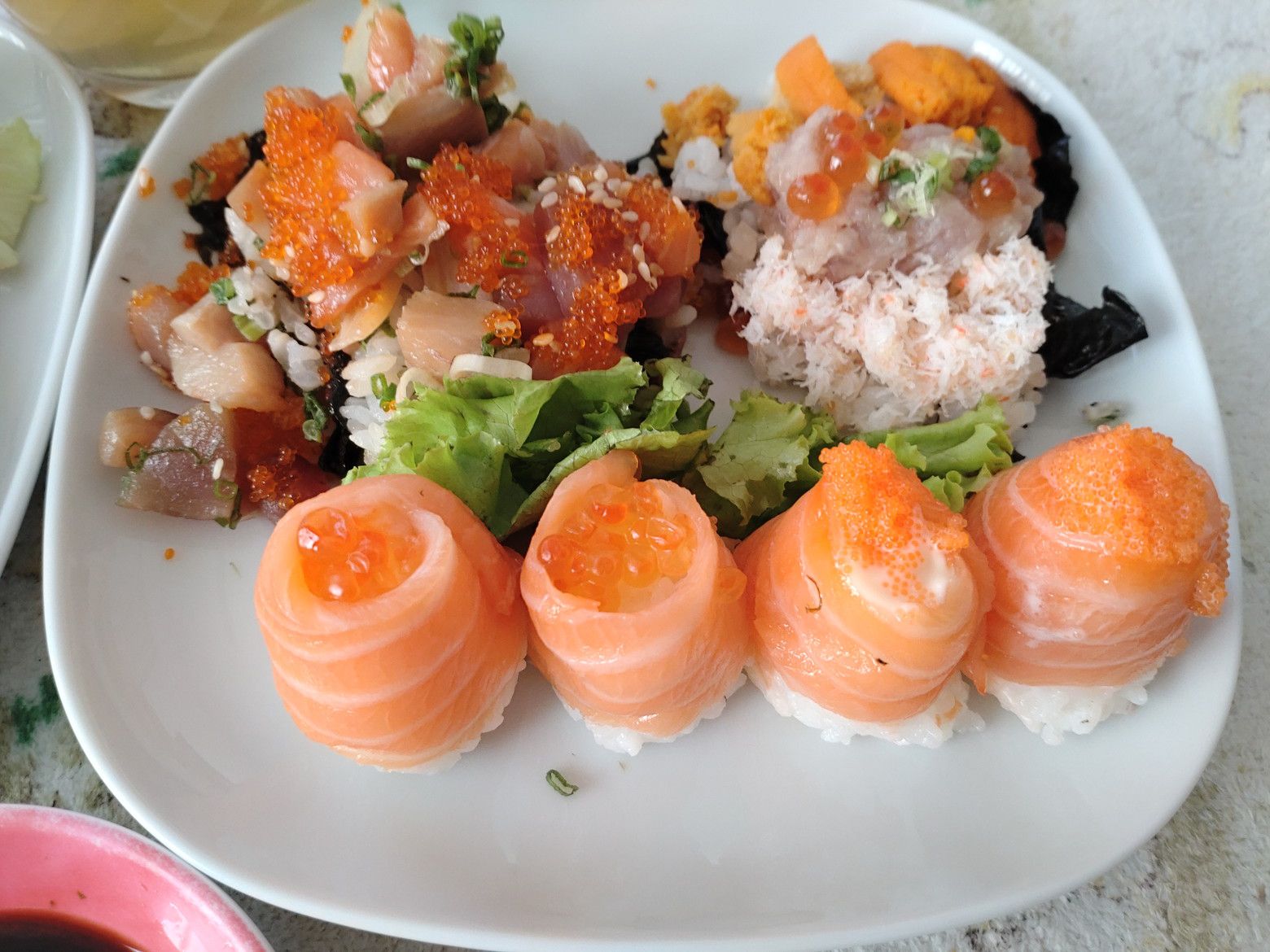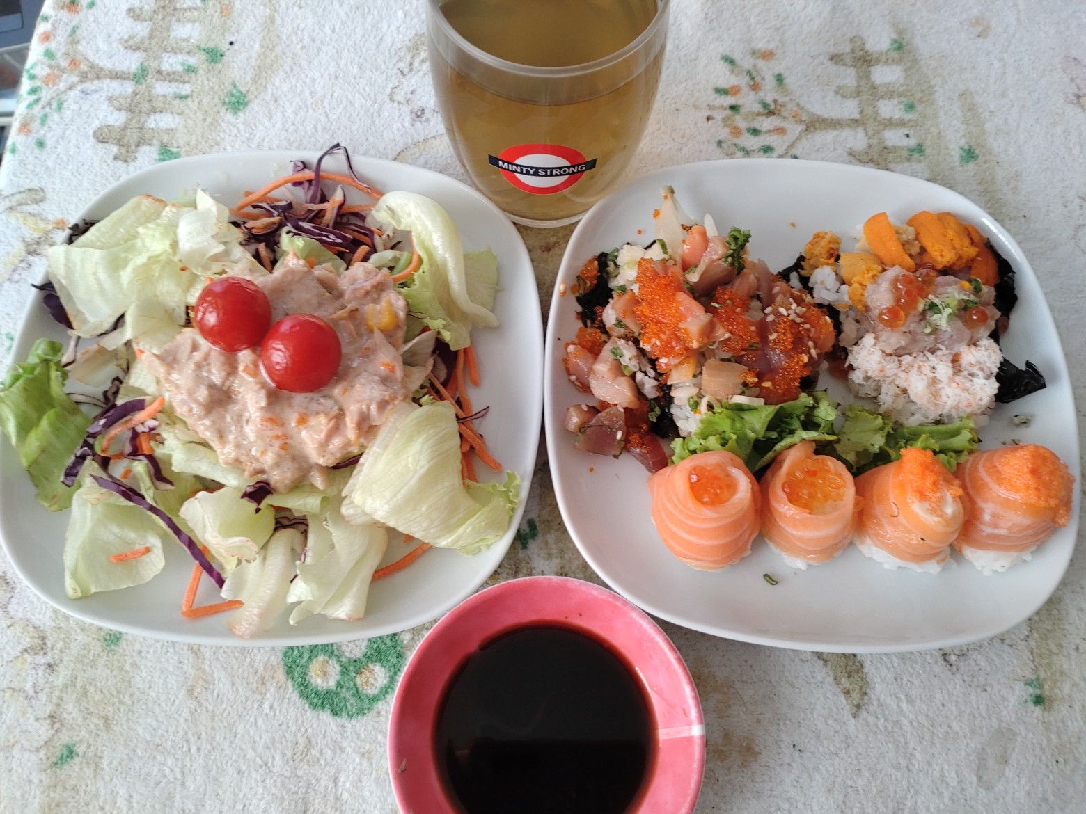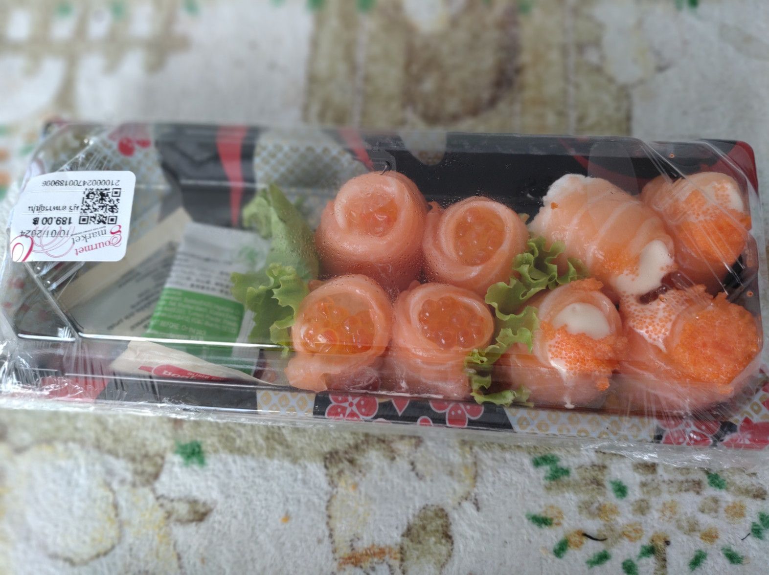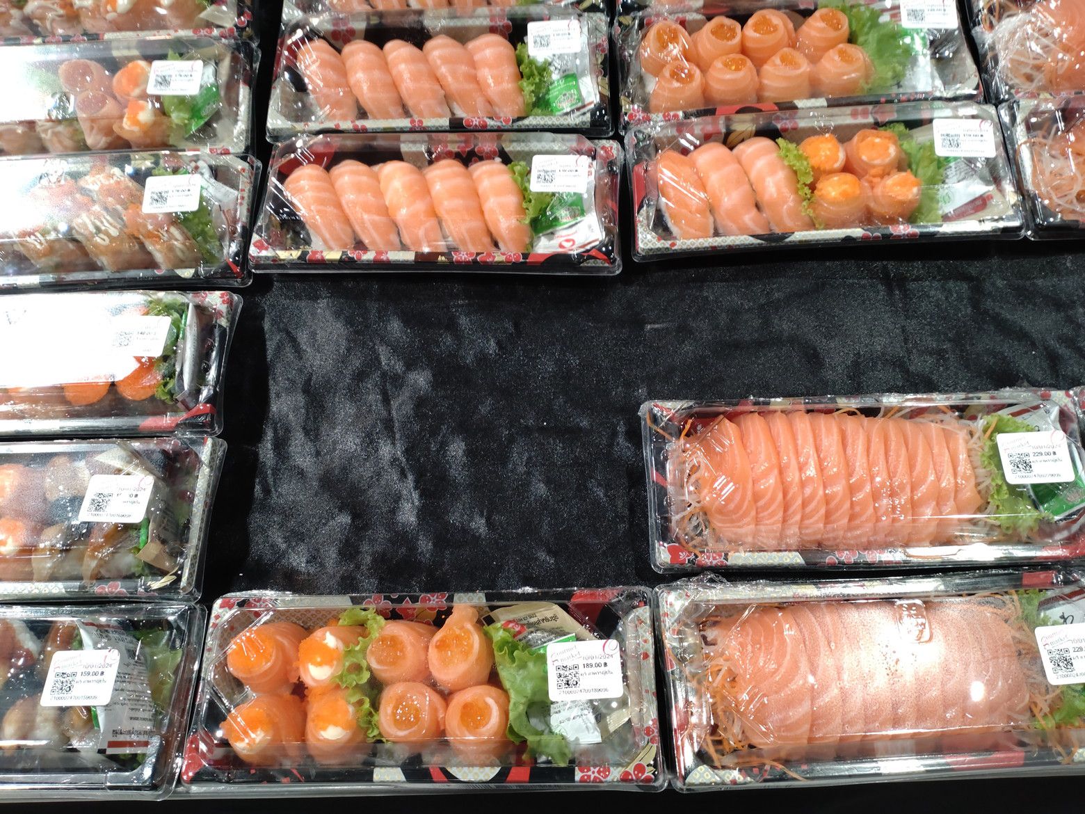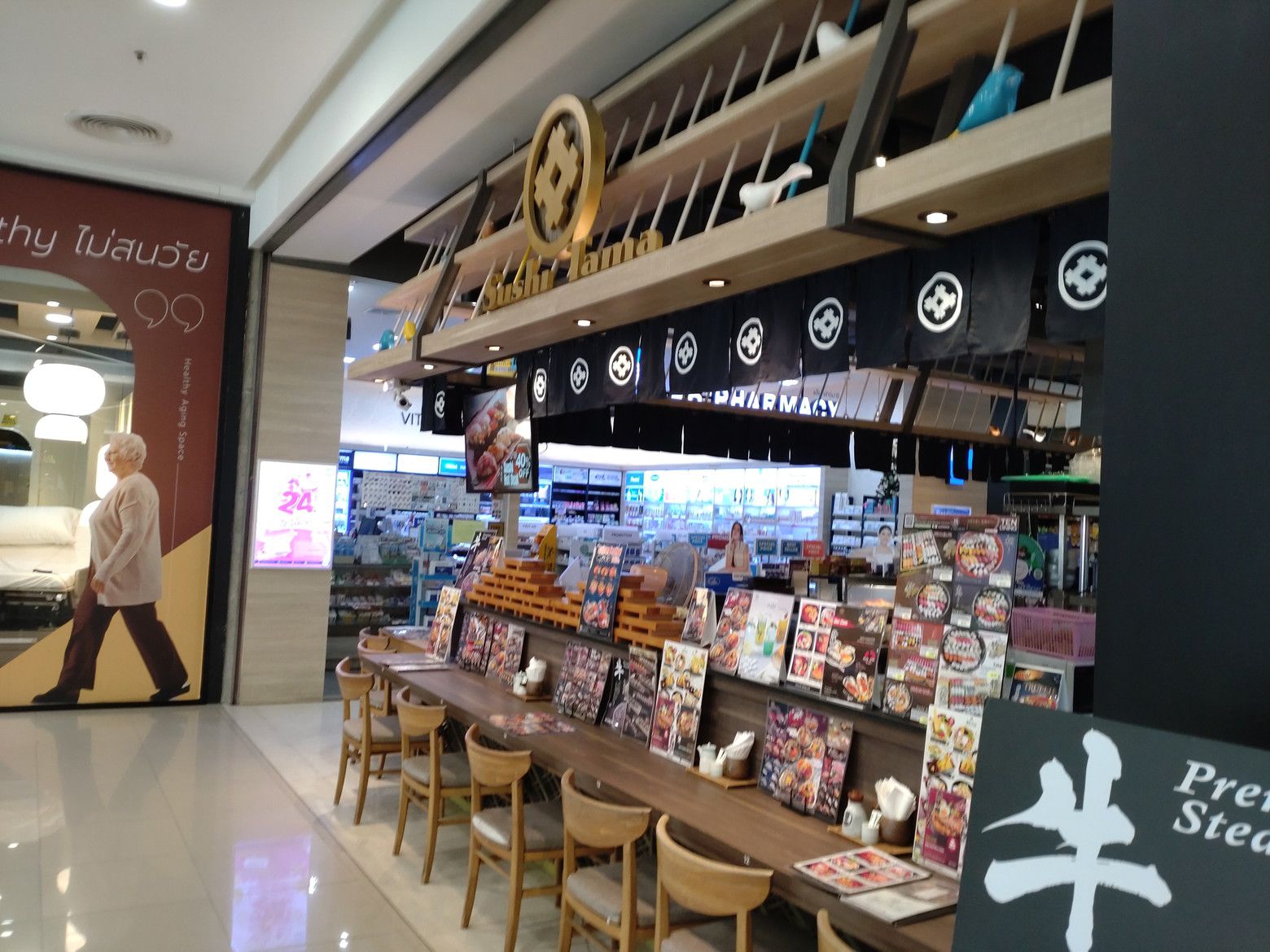 セントラルデパートを出てからは。。。 数百メートル先のショッピングモールを目指しました。 帰宅する為には、横断歩道も無い道路の反対側のバス停へ行かなければなりません。 渡る為の歩道橋の近くには、ショッピングモールがあったんです。 セントラルでは、調子に乗って歩き回りました。 帰りのバスで、寝込んではダメです。 ただ、折角来たので食料品でも買って帰ろうと思ってました。 エアコンが効いたフロアーで、館内に何かあるか暫くチェックしました。 すると、こんな日本食屋さんが在ると判ったのです。 2種類の手巻き寿司を注文しました。 260バーツ。