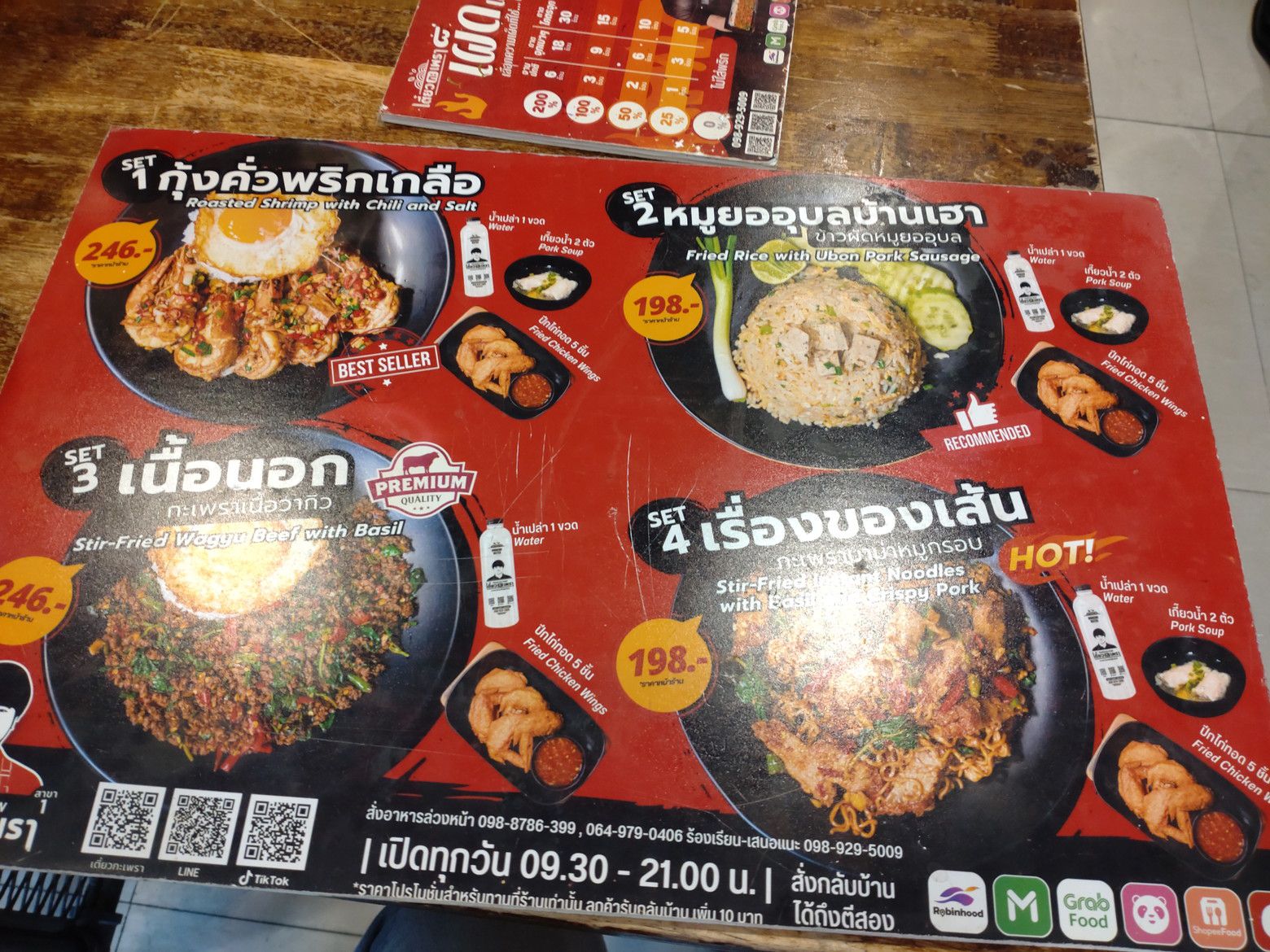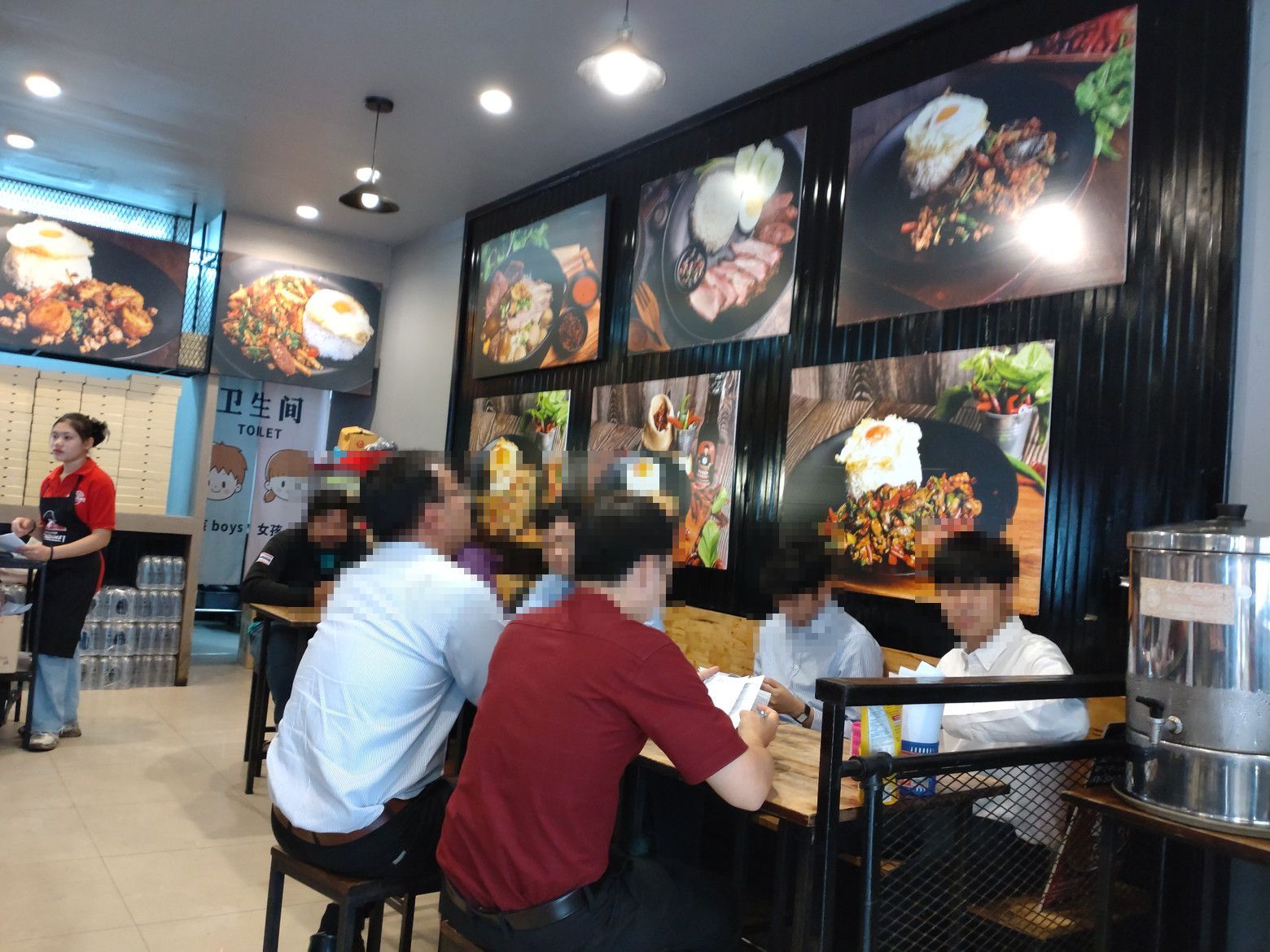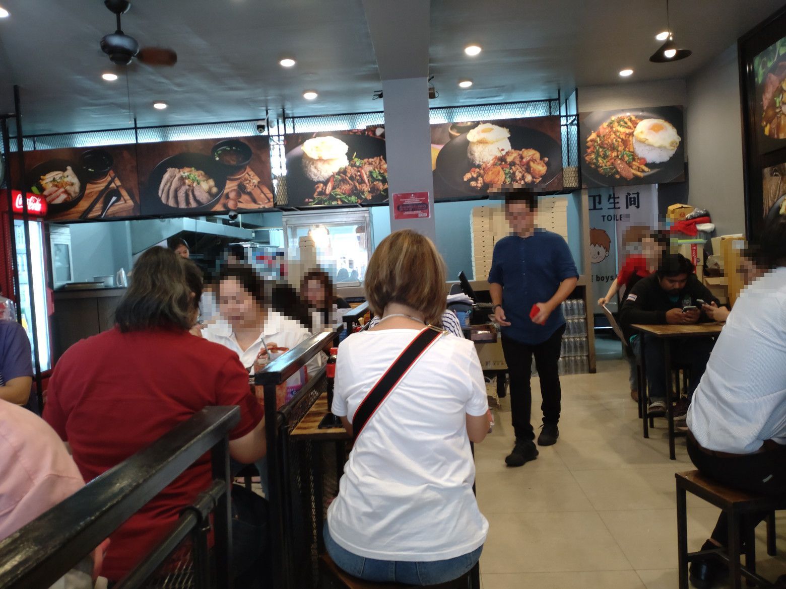 記入は出来ないので、店員さんを呼んで、口頭で牛肉のガパオと目玉焼きを注文しました。 この時は、ほぼ満席状態。 更に、グラブなどの配達員の出入りも、頻繁な状態でした。