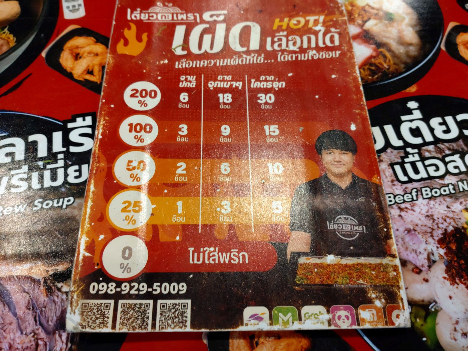 その専門店に再びやって来ました。 此処のメニューは、非常に多いのですが、写真付きのメニューは、これだけ。 しかし、各テーブルには記入用紙が用意されていて、自身で記入してオーダーするタイプの店なんです。 そして、これが辛さレベル。