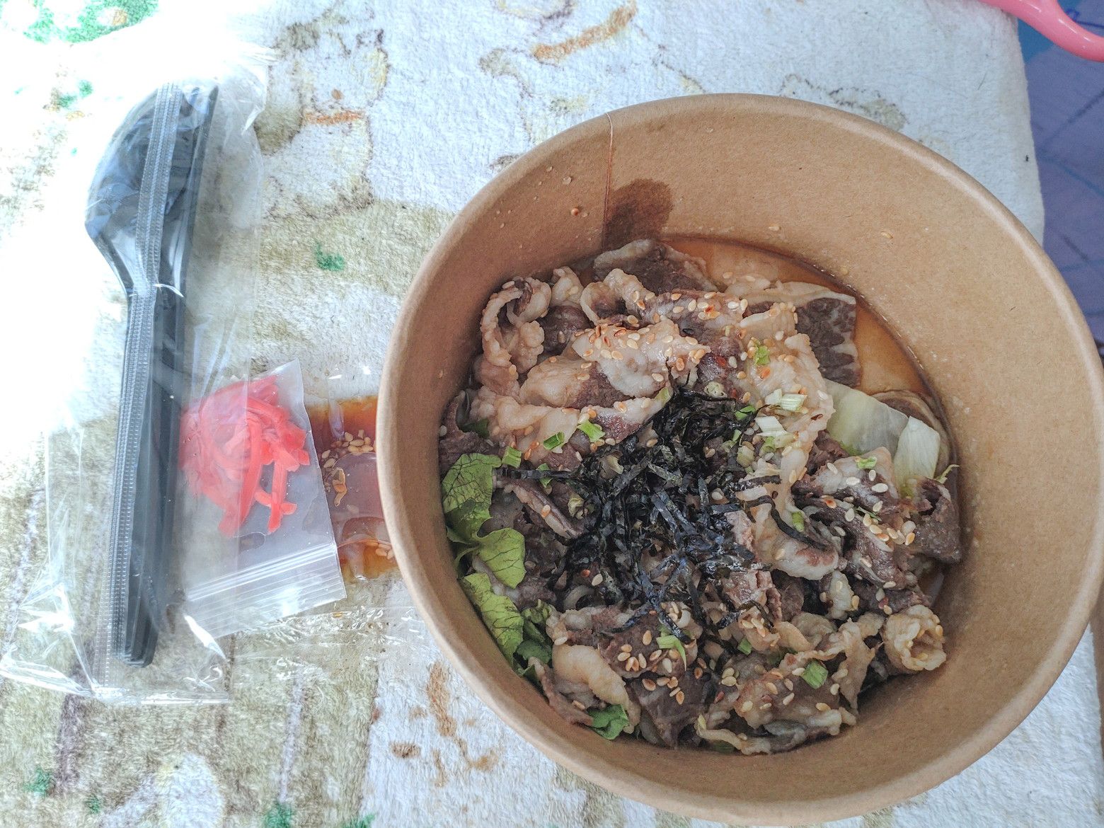 奥にはフードコートも在りますが、色々な店が並んでいて、見学するだけでも、かなりの時間を要します。 椅子やテーブルもあります。 巡り巡って、今回は此処にしました。 牛肉がズラリ。 カルビ和牛を注文しました。 受け取り完了です。 中身は、焼いた肉だけなので。。。 一時帰国の際に買って来た、新米を出してきました。 新しい種類の米です。 炊くと、こんなにふっくら。 肉も御飯も、予想をはるかに超える美味さでした!