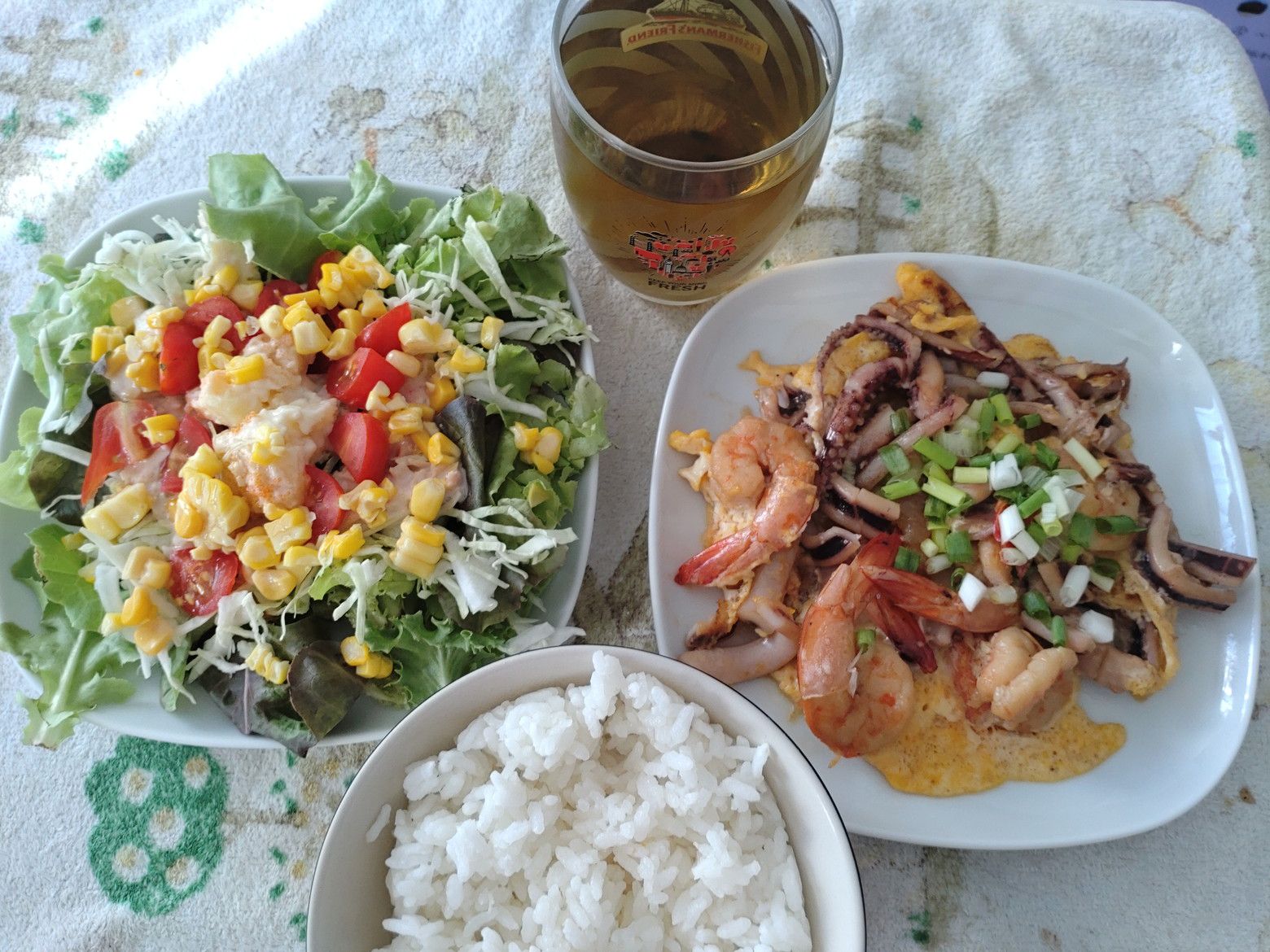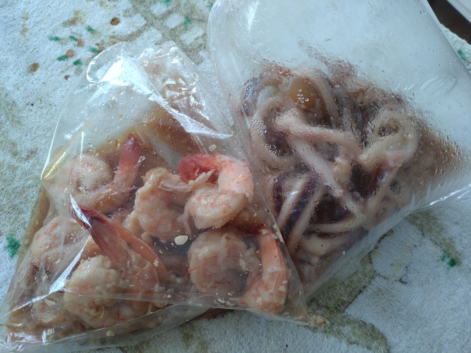 多くの袋が並んでいるのは、準備万端な様子を示しています。 烏賊と海老の袋を購入です。