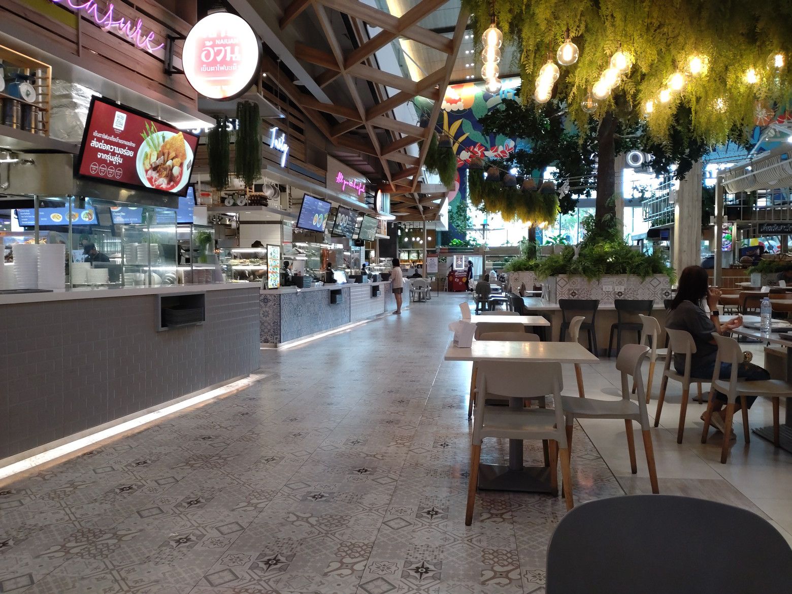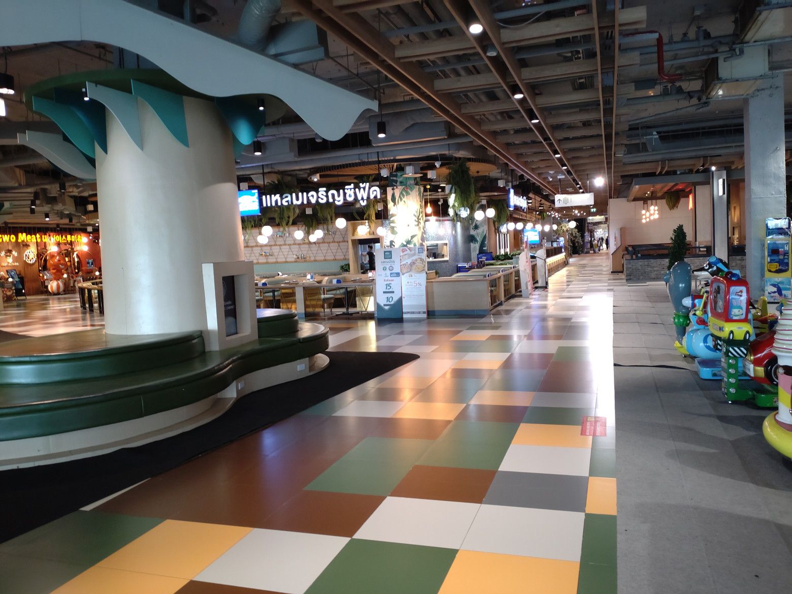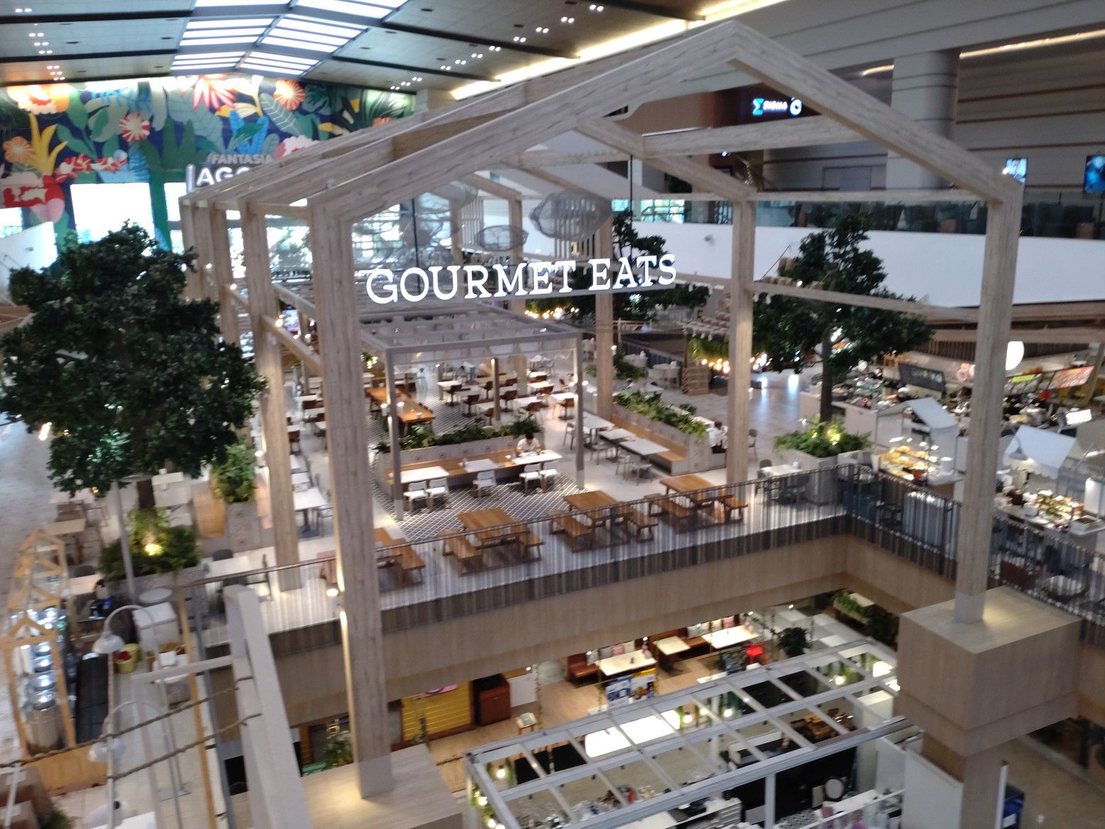 こんな休憩所もあるのですが、既に数人の女性が座っていました。 このような景色を眺めながら歩いていると、気分も最高です。 此処までは、レストランが入るスペースなのですが。。。 先に進めば、フードコートのフロアーへ繋がります。 到着です。