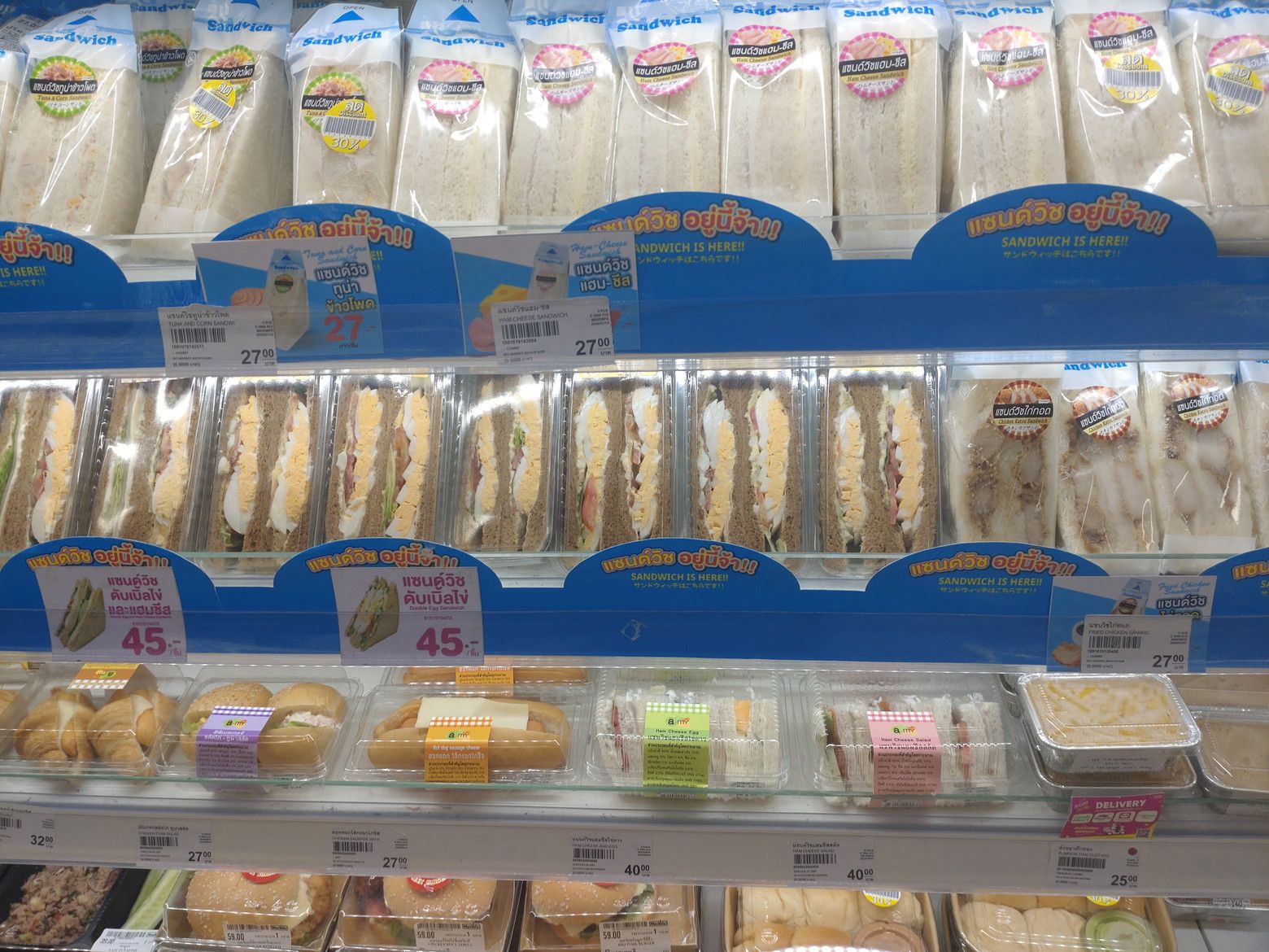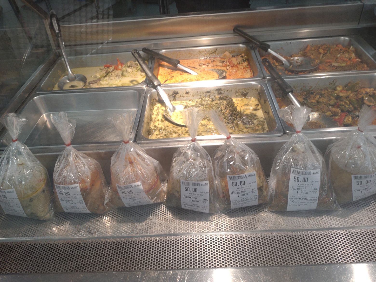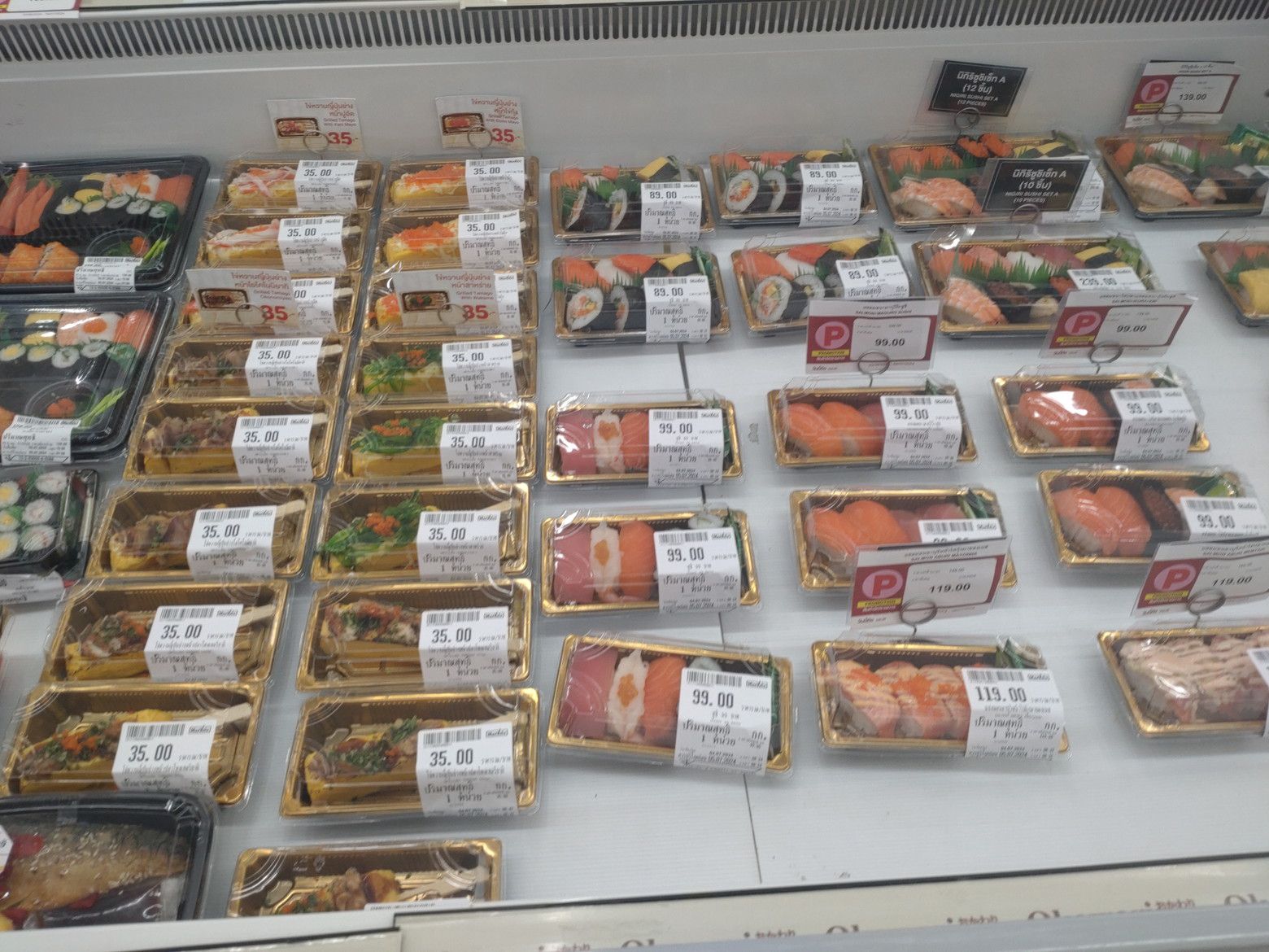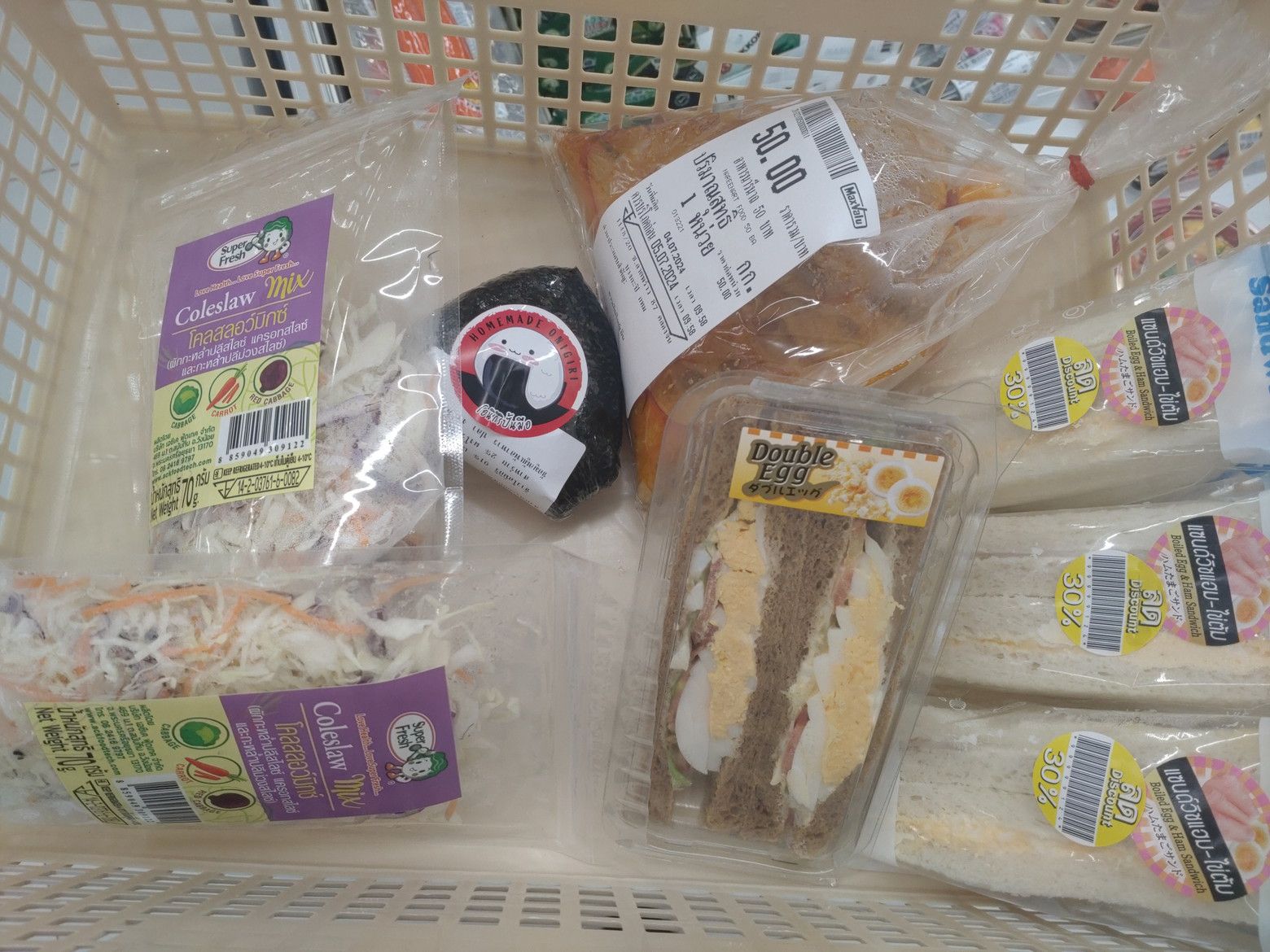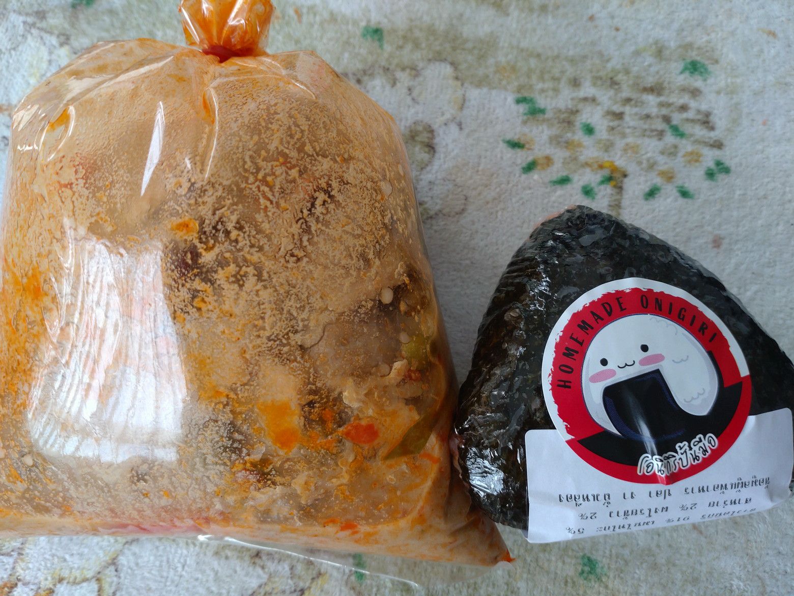 多くの種類の惣菜も売っています。 ありました!! お手頃価格の寿司も売っています。 弁当も種類が豊富です。 ”おかわり”という店も。。。 その店で、50バーツのタイ料理があったので、試しに1袋買ってみます。 明太子のおにぎりもありました。 嬉しいですね。