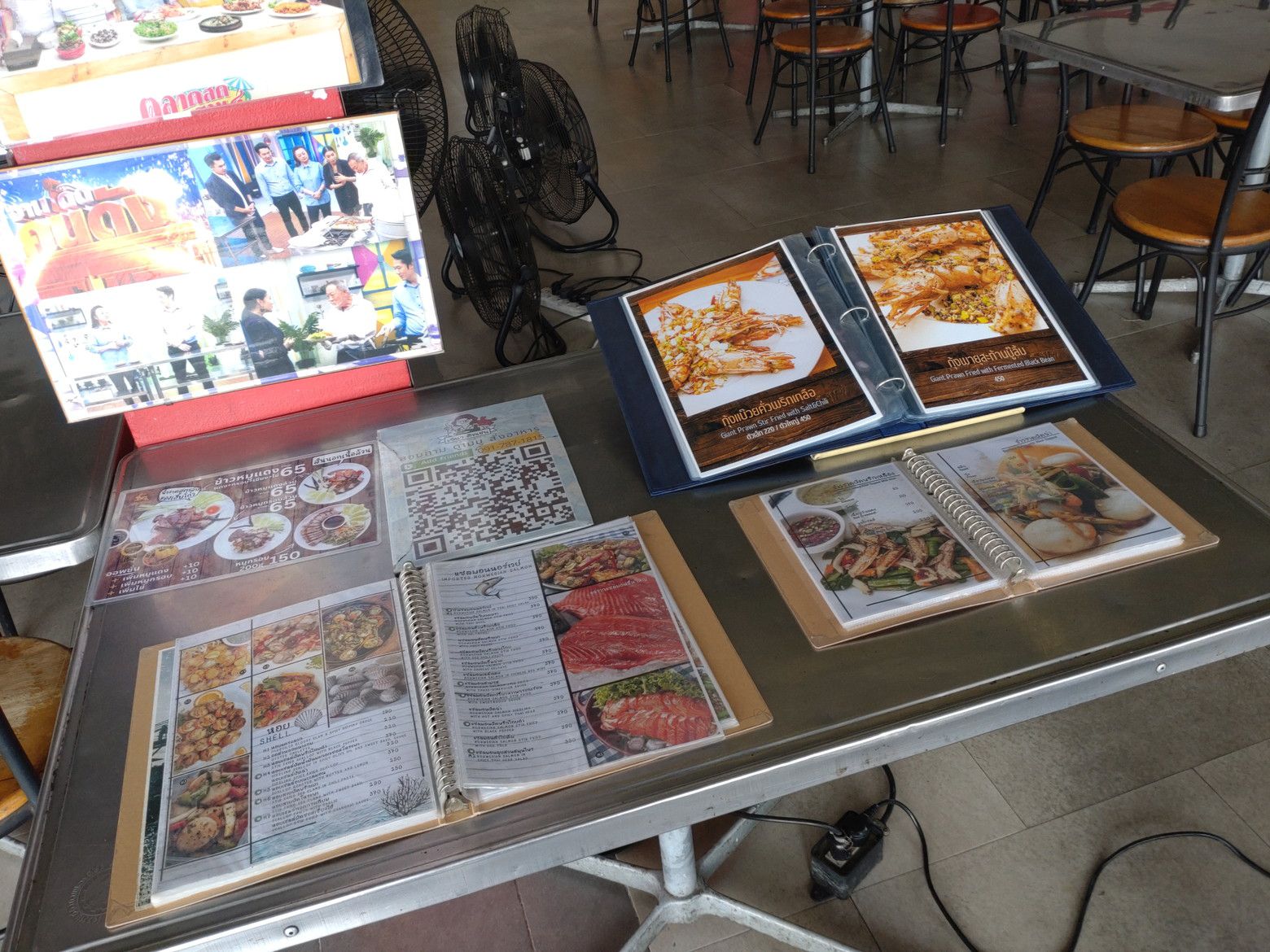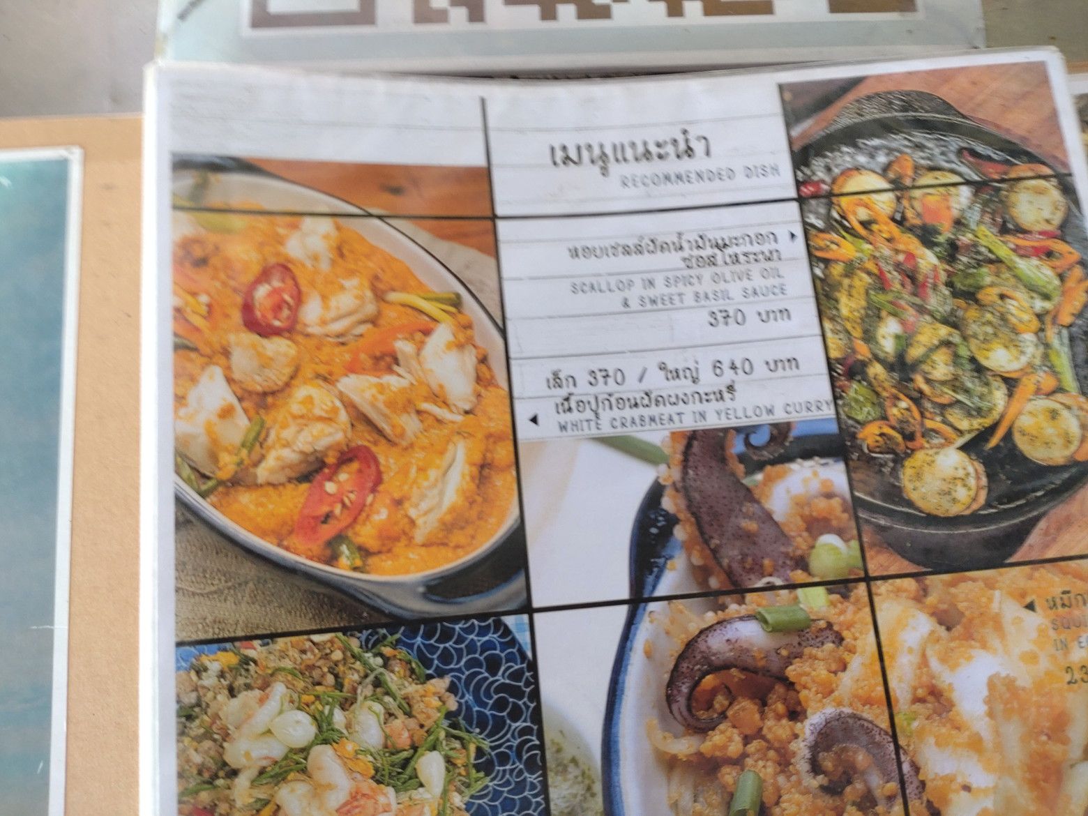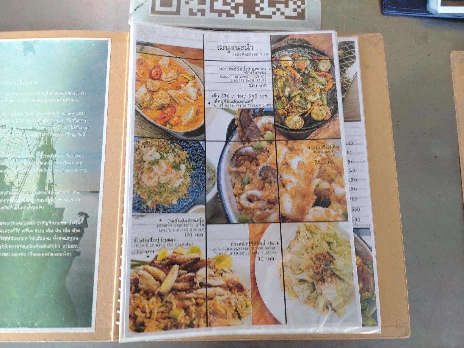 早朝か?夜か?がメインかもしれません。 メニューが置かれたテーブルがありました。 蟹肉カレー炒め(プーパッポンカリ)がありましたので注文です。 見ていたメニューは、この店の物でしたので伝えに行きました。 暫くして受け取り完了です。 これで、370バーツ。 非常にボリュームたっぷり。 御飯と一緒に食べると最高でした!!