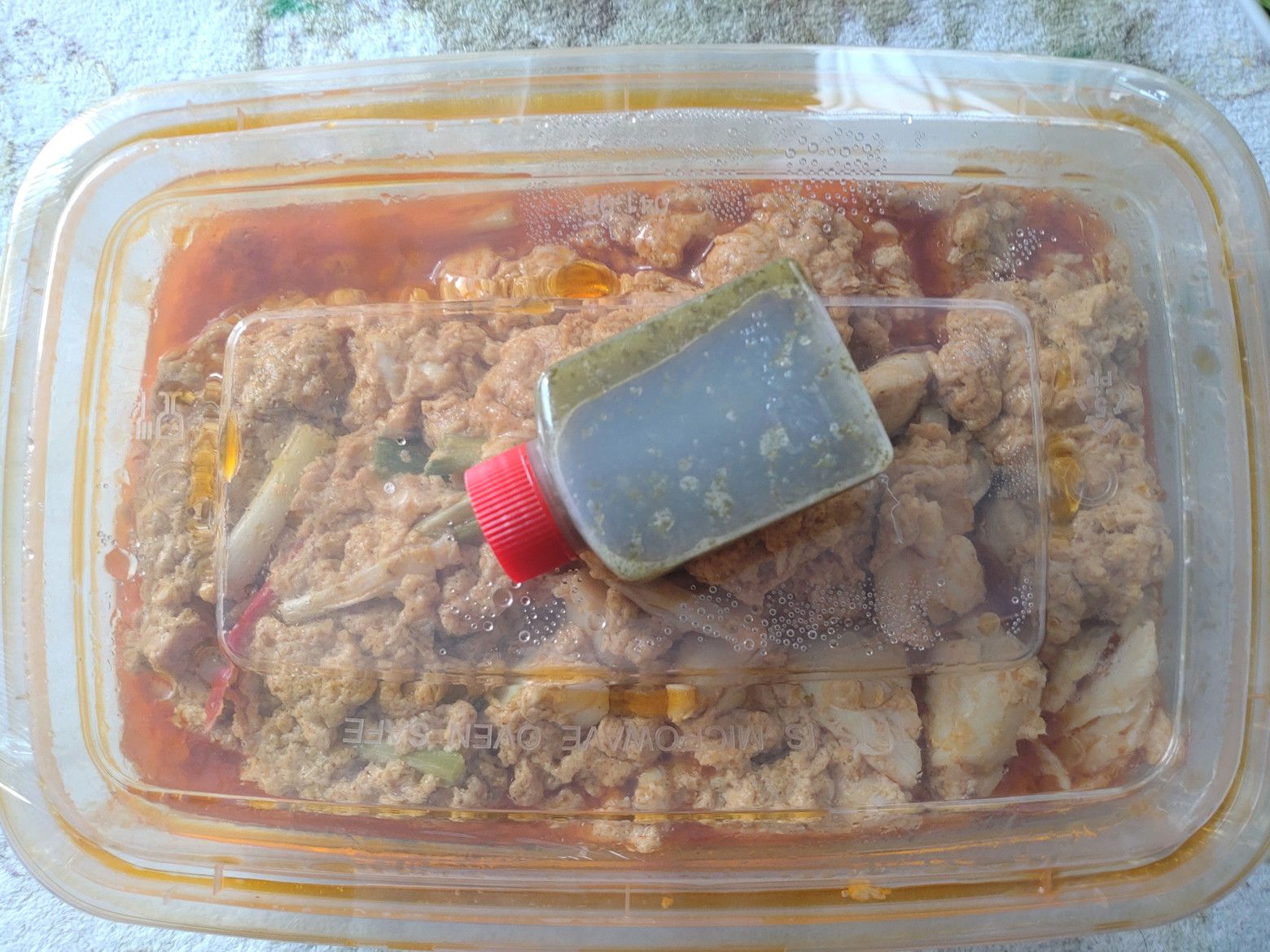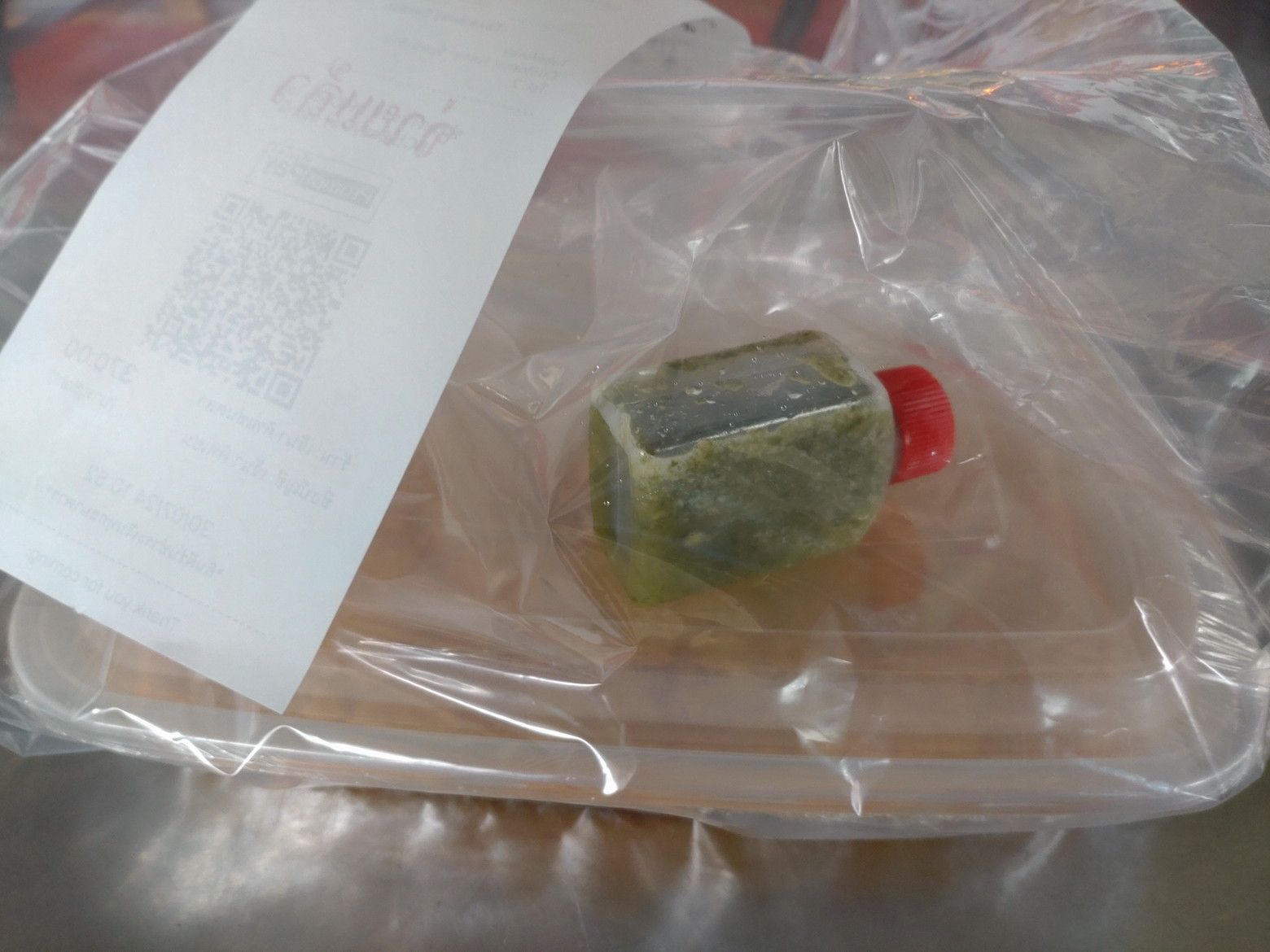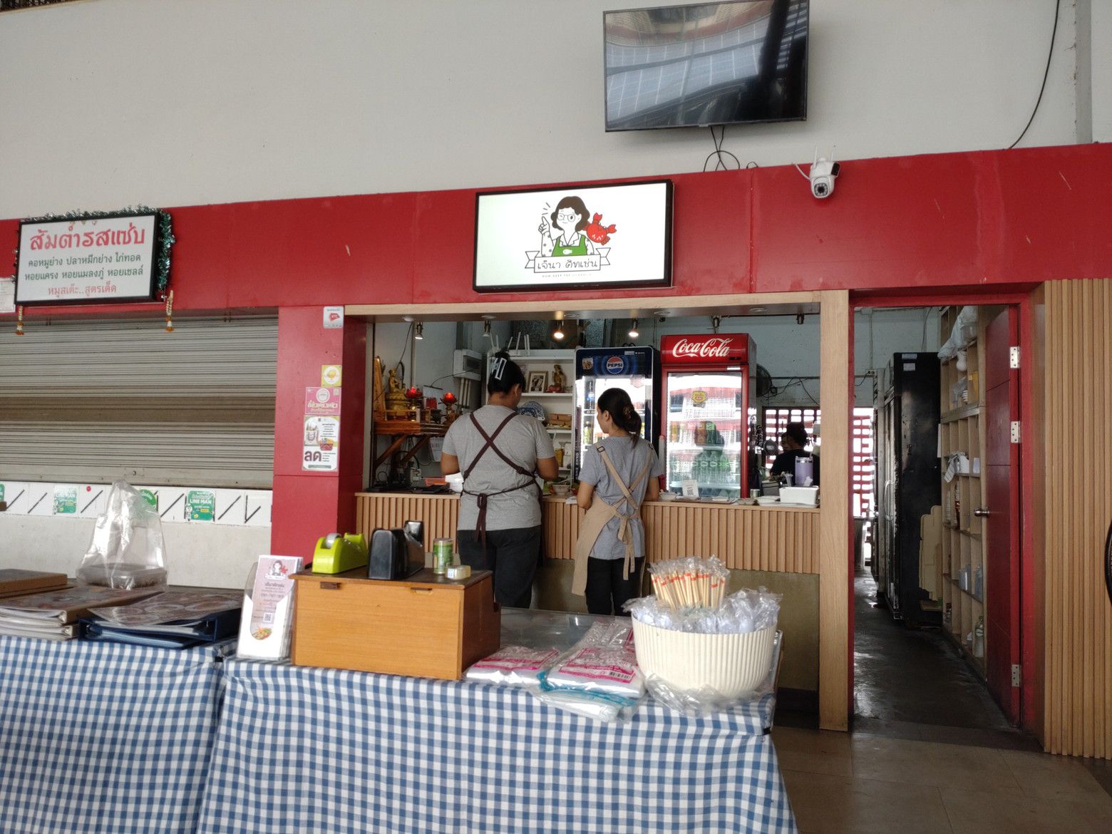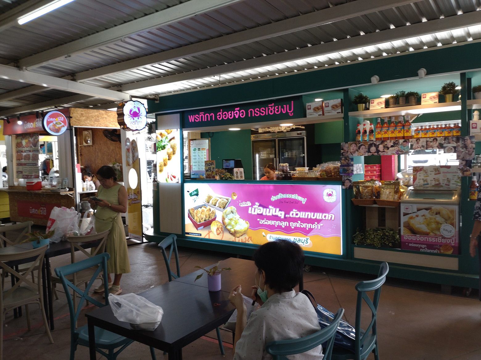 早朝か?夜か?がメインかもしれません。 メニューが置かれたテーブルがありました。 蟹肉カレー炒め(プーパッポンカリ)がありましたので注文です。 見ていたメニューは、この店の物でしたので伝えに行きました。 暫くして受け取り完了です。 これで、370バーツ。 非常にボリュームたっぷり。 御飯と一緒に食べると最高でした!!