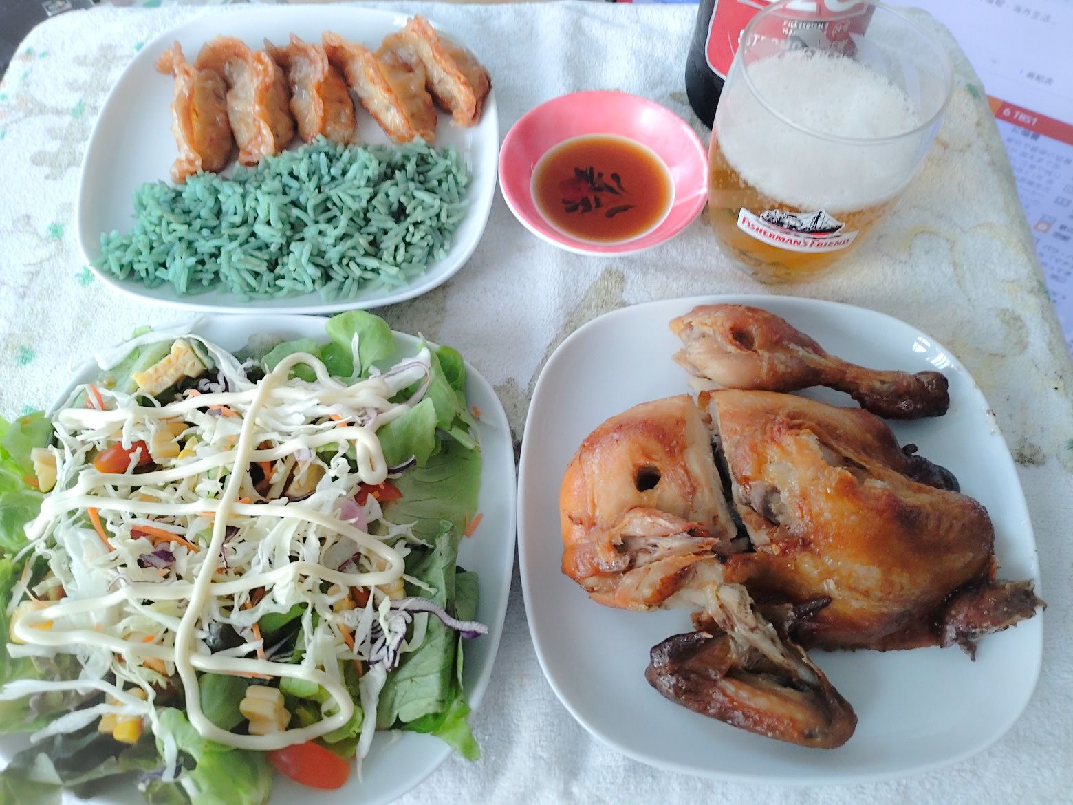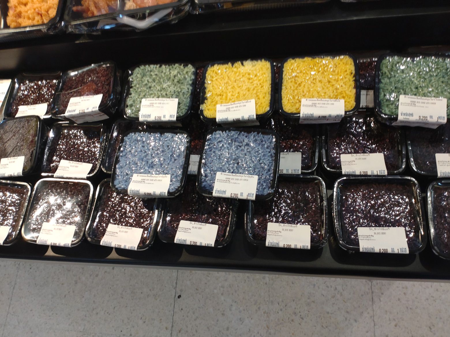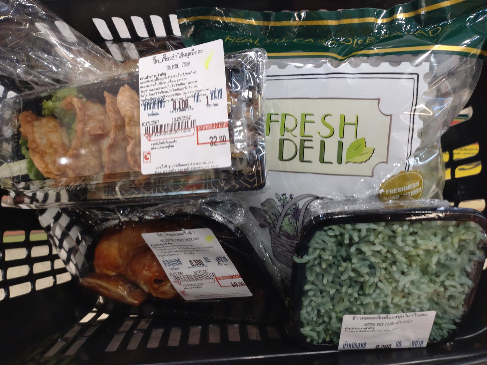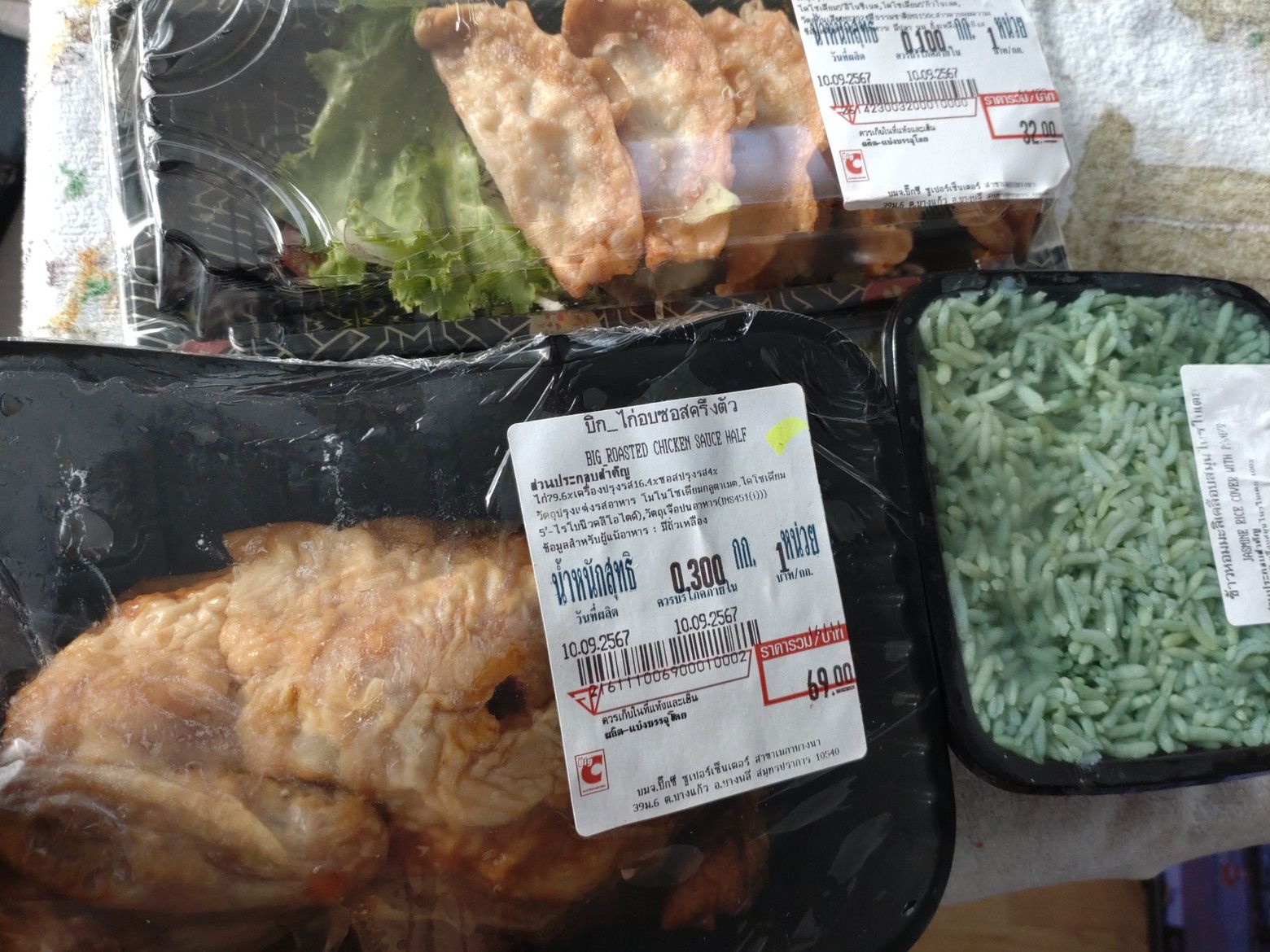 各種の色から緑を選択です。 貼っているシールをよく確認すると。。。パンダンリーフの緑色でしょうか?? 会計を済ませました。 この3種の合計は、約100バーツと少し。 ガイヤーンを少し焼いてから食べる事にしました。