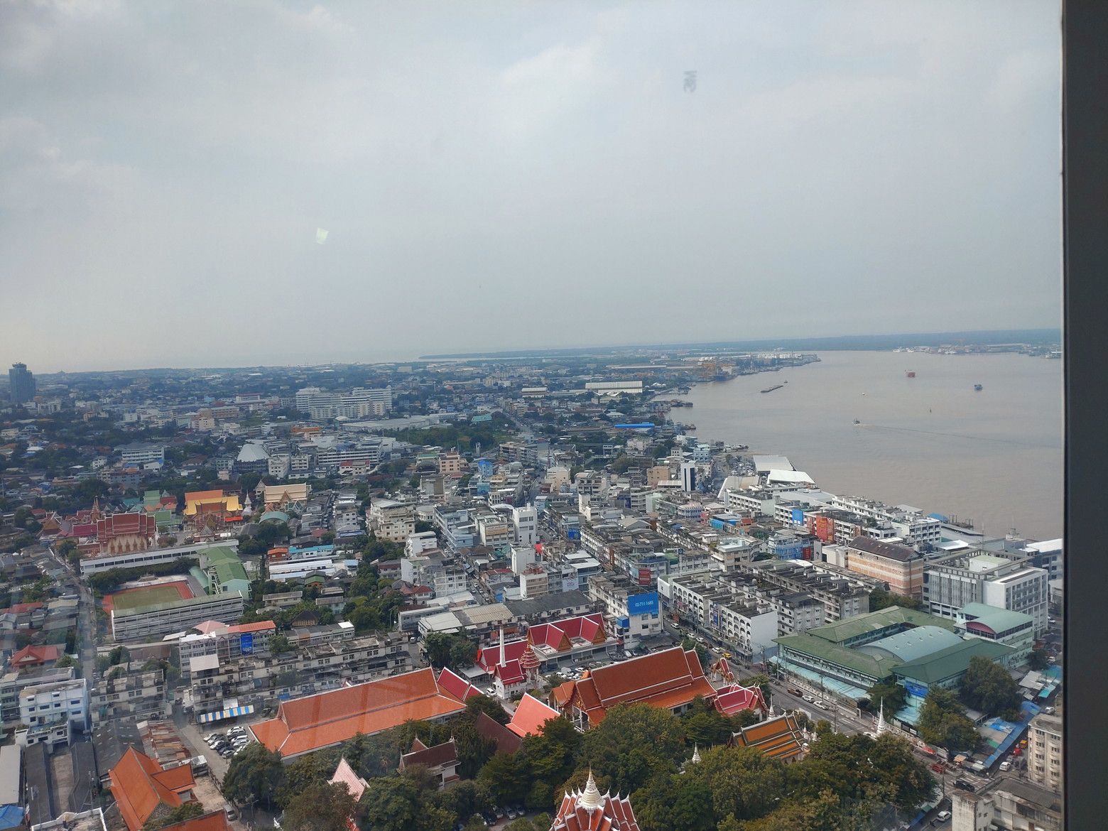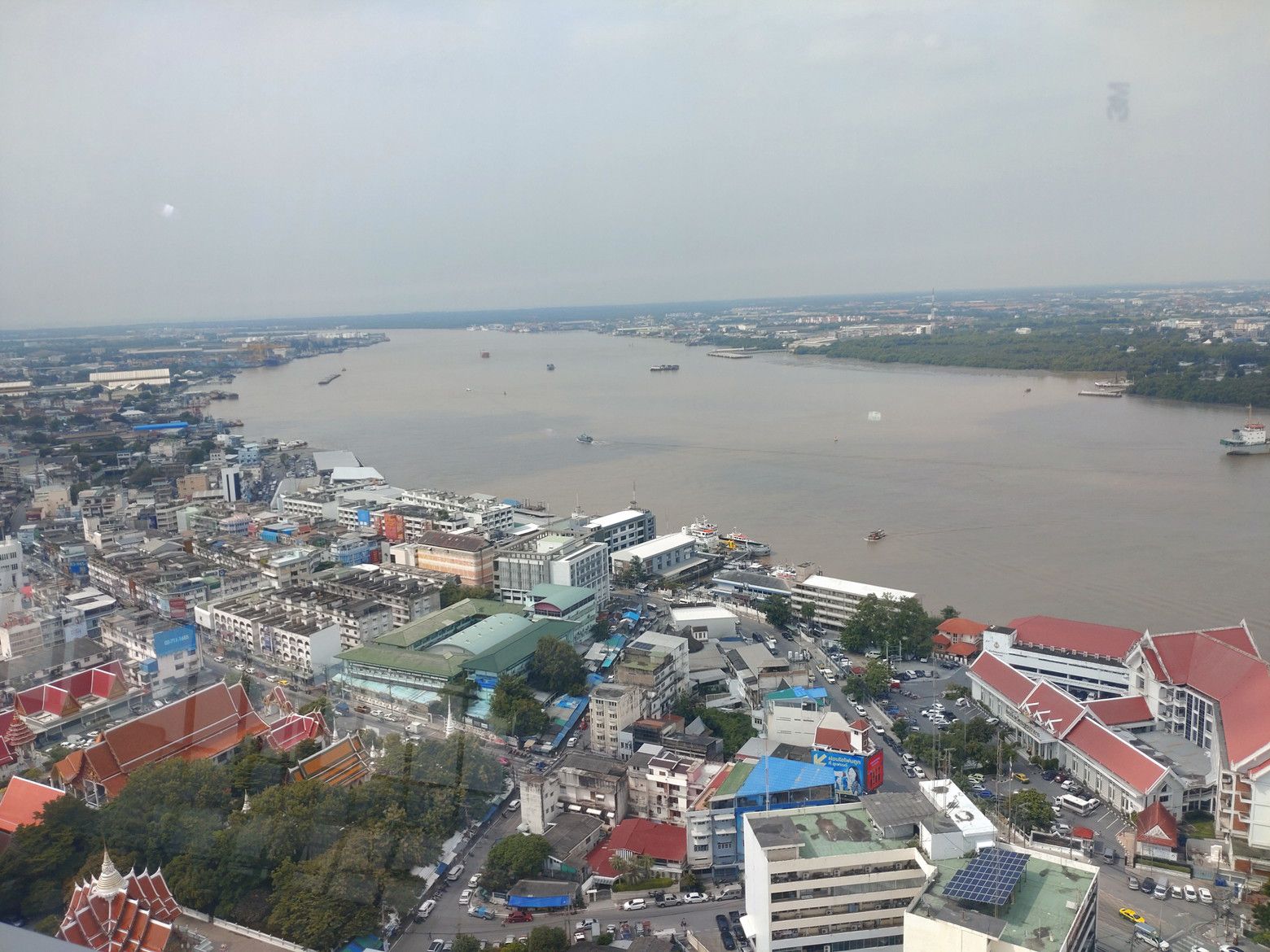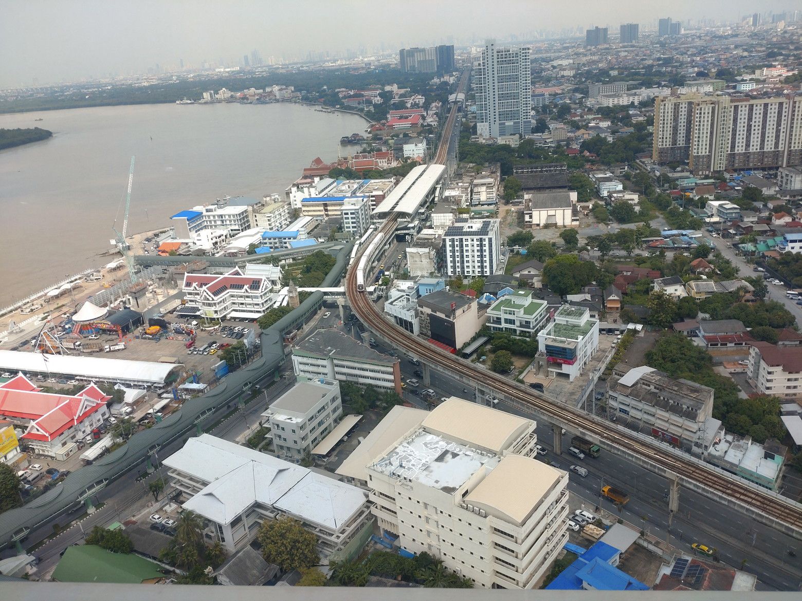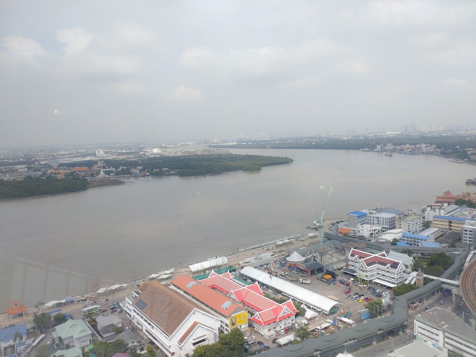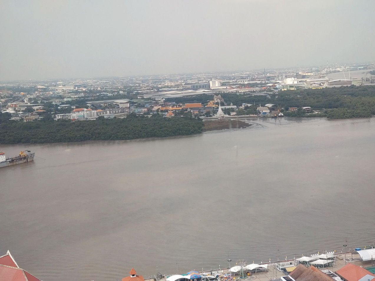 列車が、あれだけ小さく見えます。 これが、チャオプラヤ川の上流方面です。 これが、下流方向です。 これが、対岸のプラサムットチェディー方面です。 写真では判り難いかもしれませんが、河口側を再度良く見ると。海も見えました。