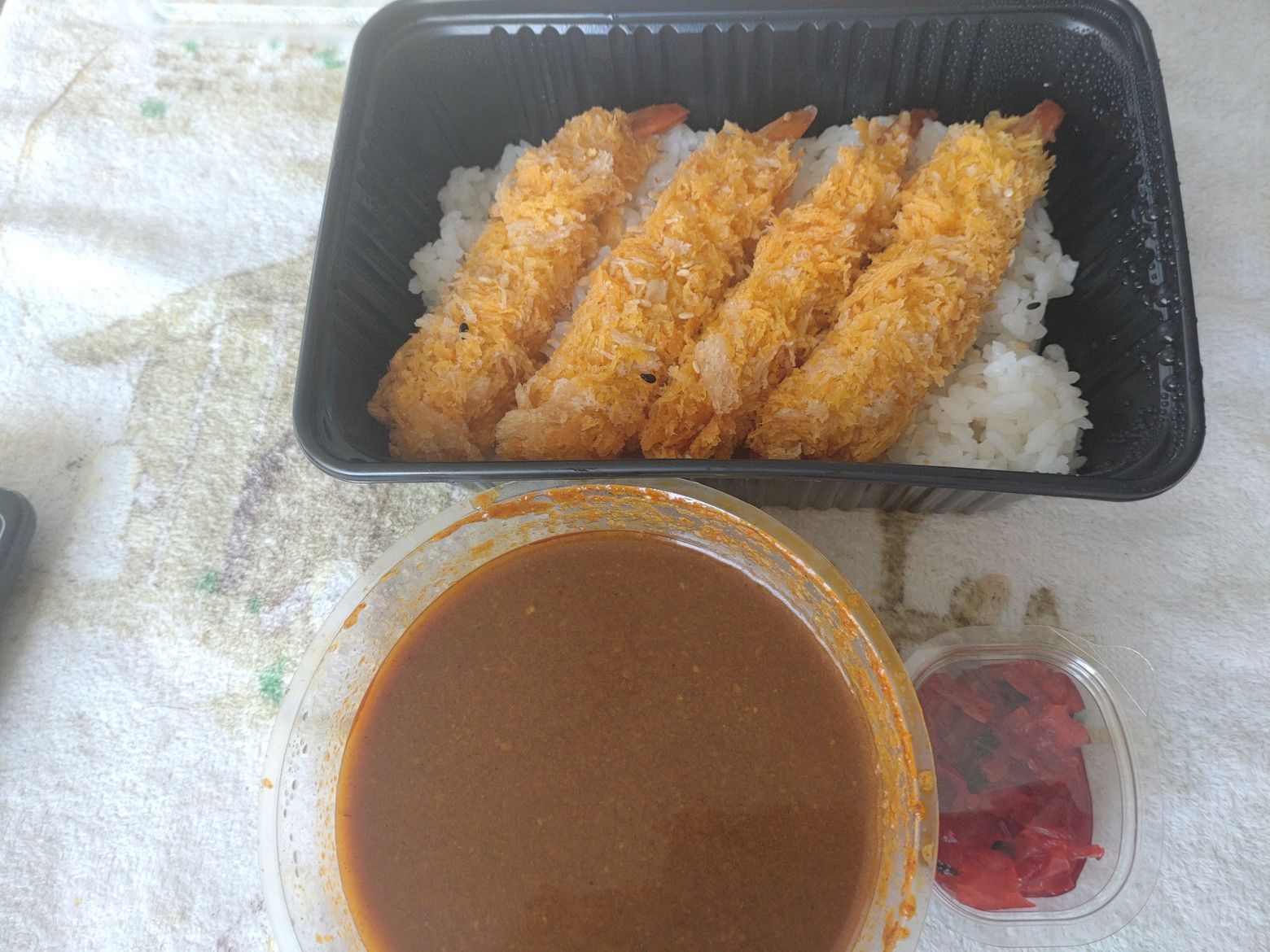 受け取り完了です。 これが中身です。 盛り付けして分ったのは、御飯は日本米です。 特別に個性は無く、普通の美味しい日本式のカレー味がしました。