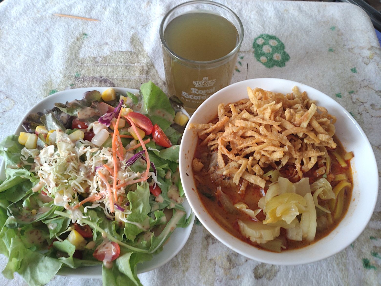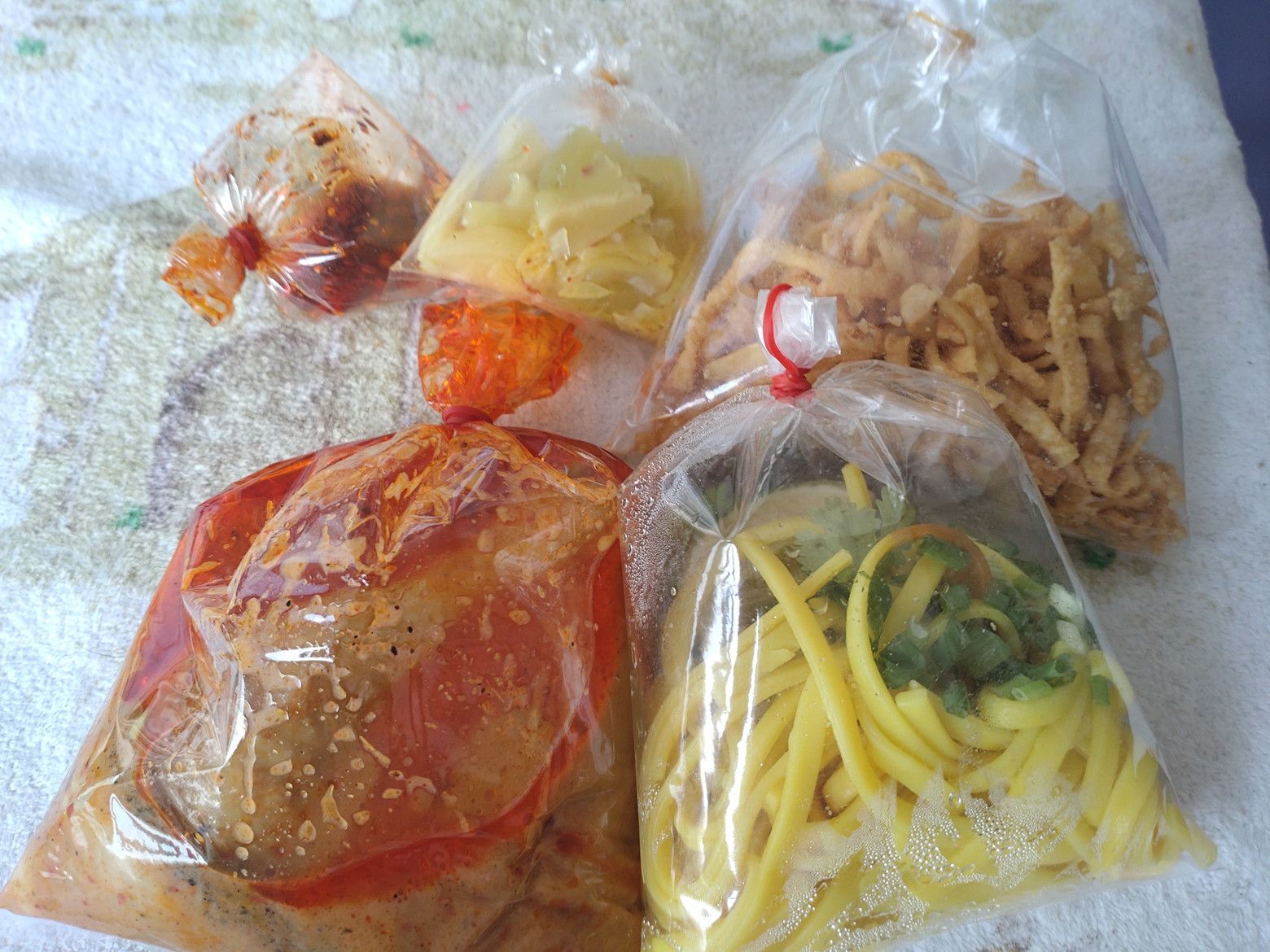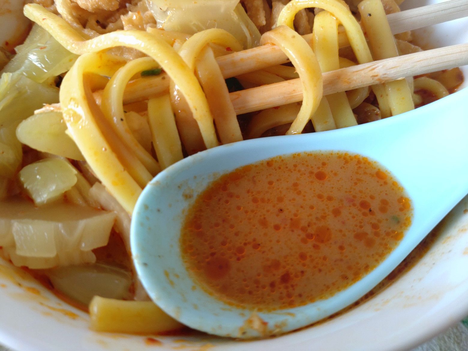 ちなみに、道路を隔てて正面には、日本風のカフェがありました。 こんな所にも日本がありました。 さて!綺麗に細かく分けて包んでくれています。 熱々スープです。 まずはスープを飲んでみると、辛さは殆ど無し。