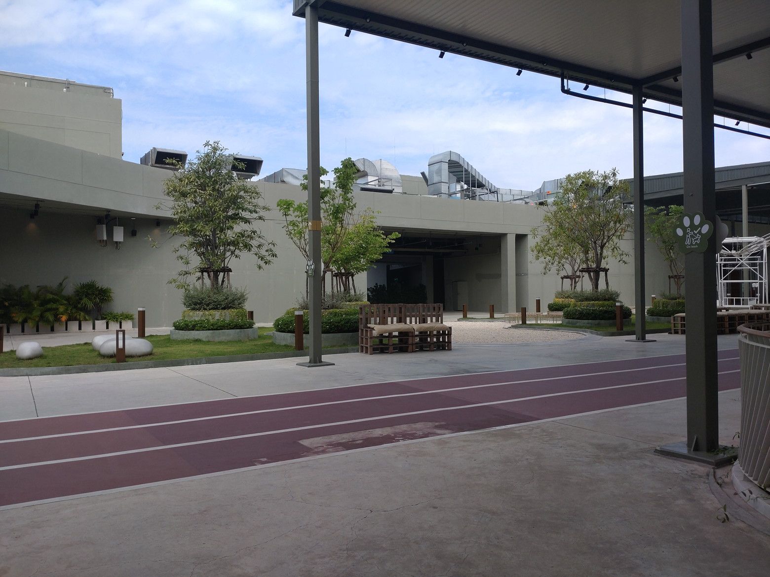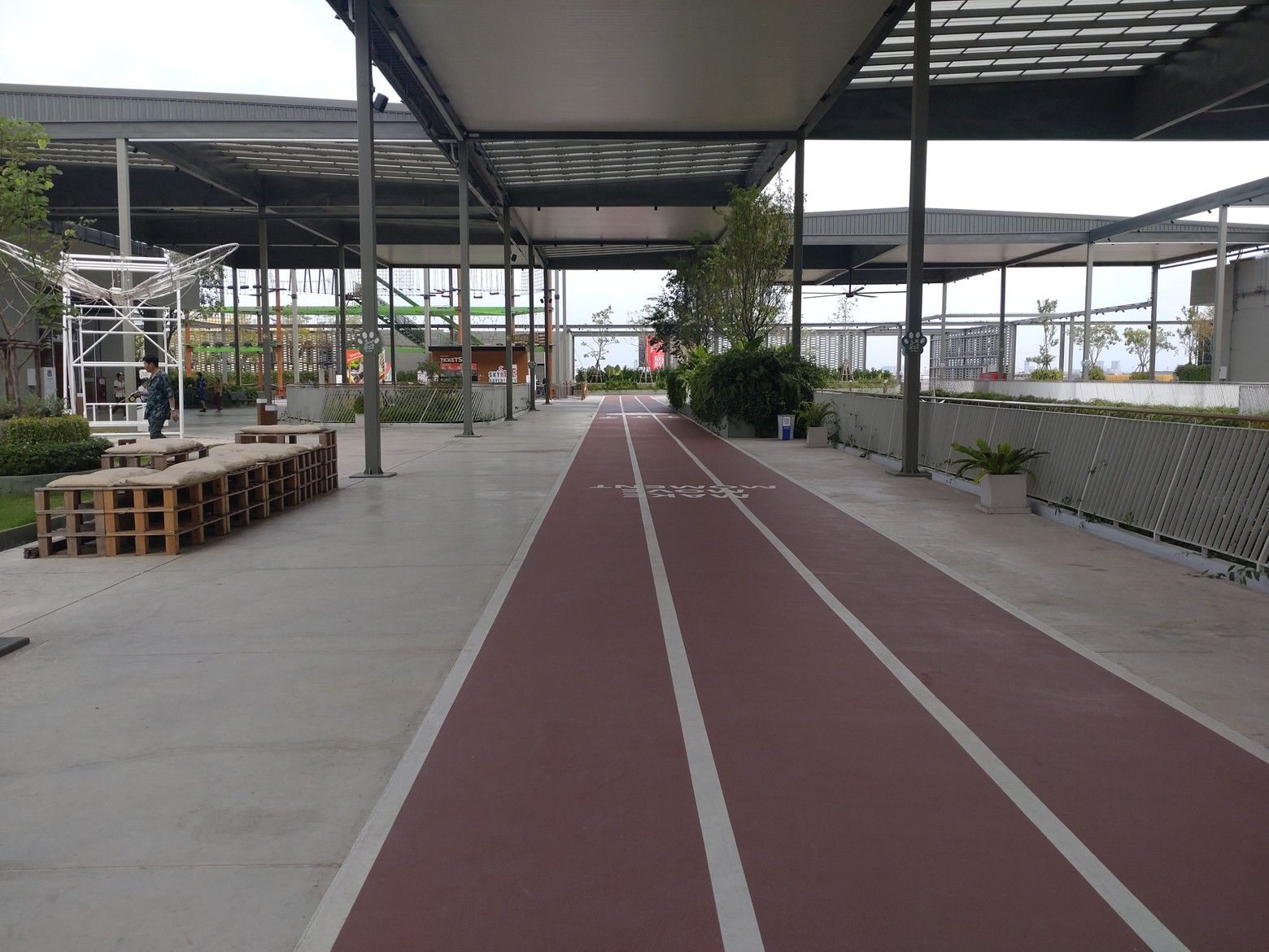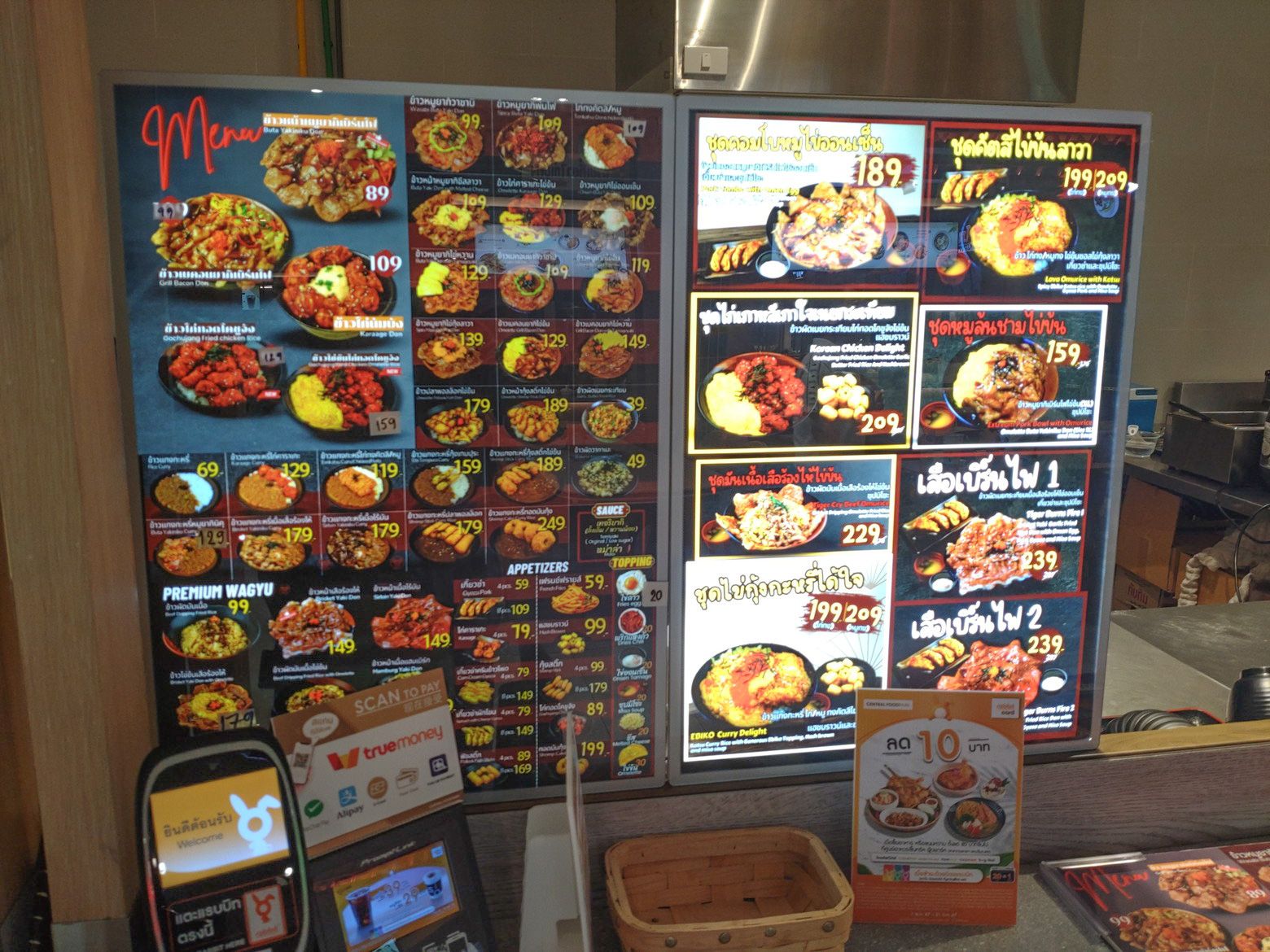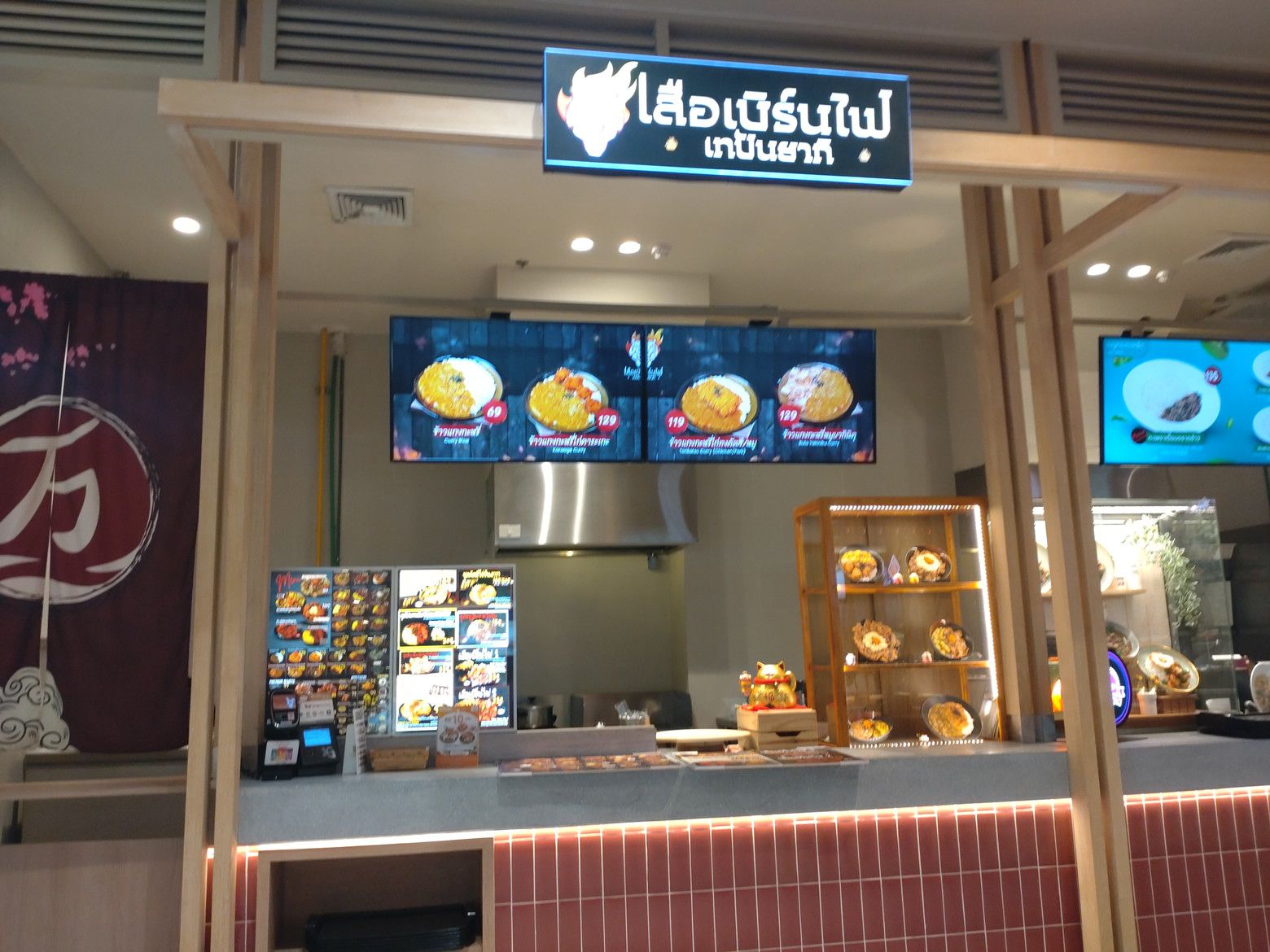 子供の遊び場には、朝早くから遊ぶ子供たちが居ました。 更に上の階には、ウォーキングスペースがあります。 最近は、乾季なので午前中は、少し涼しいです。 そして、所々にはペット連れの方々も見受けられます。 まずは、前半の目標値に達したので、食べ物調達です。 これは、上の階にある小さめのフードコートです。 美味しい料理が揃っています。 今回は、この店にしました。 こんな多くの品揃えです。 和牛の丼を注文です。