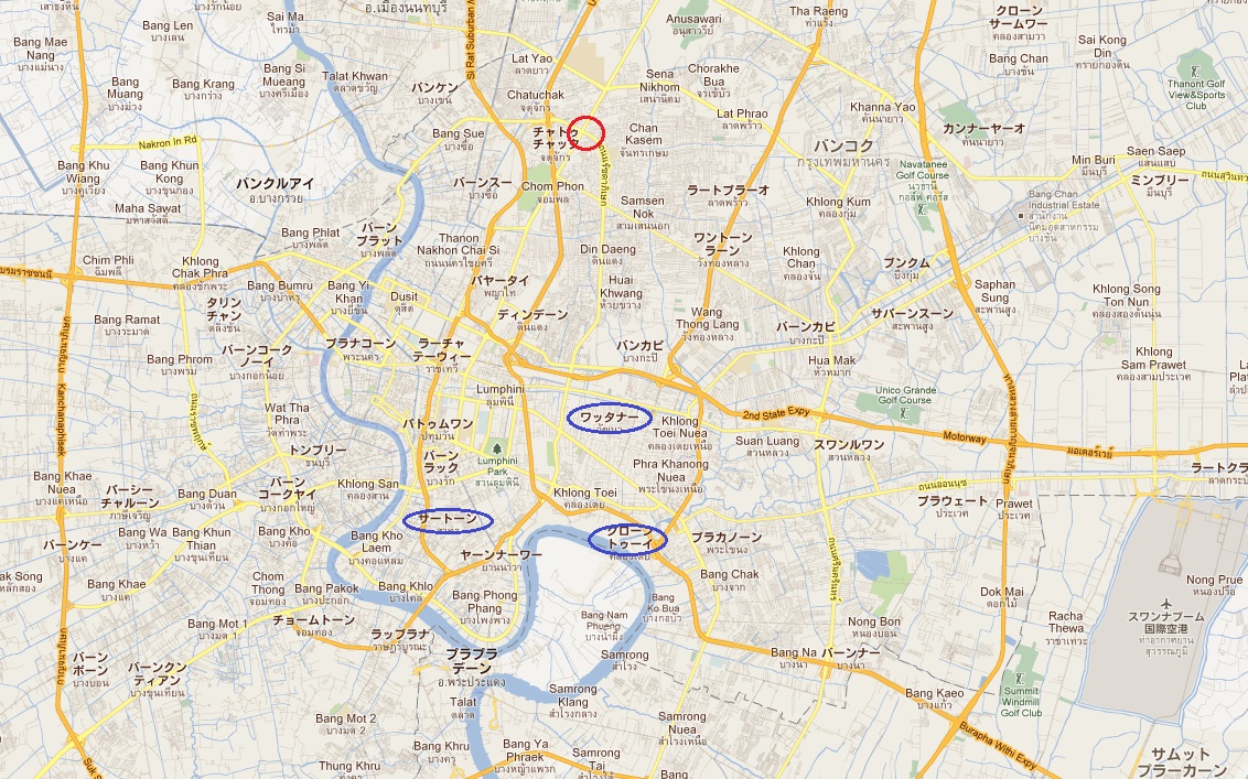 赤丸が、FROCが入るビルがある地域で、青丸は日本人が多く住む地域。